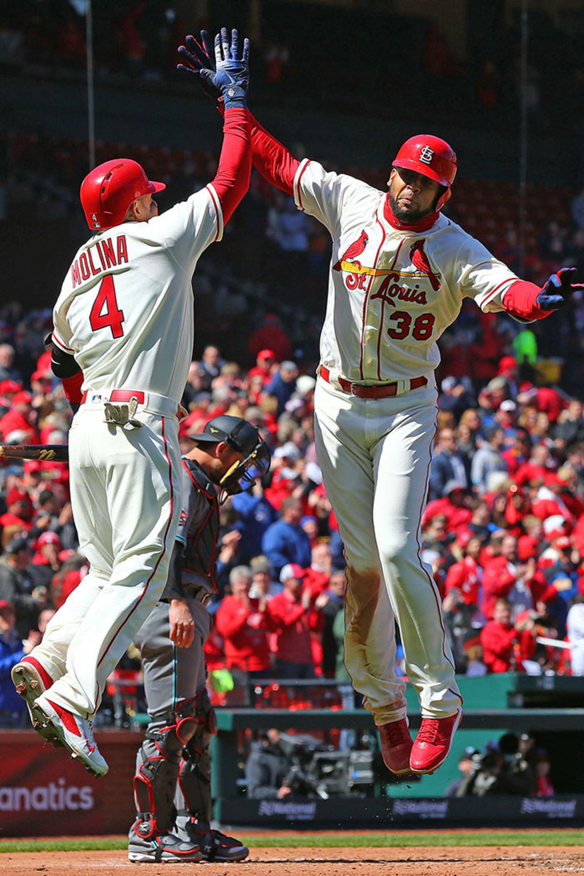 Saturday, April 7, at St. Louis - Cardinals 5, Diamondbacks 3: Jose Martinez (38) soared with Yadier Molina after the outfielder's three-run homer off Zack Greinke staked the Cardinals to a third-inning lead that held up for the team's first win at home. Dilip Vishwanat/Getty Images