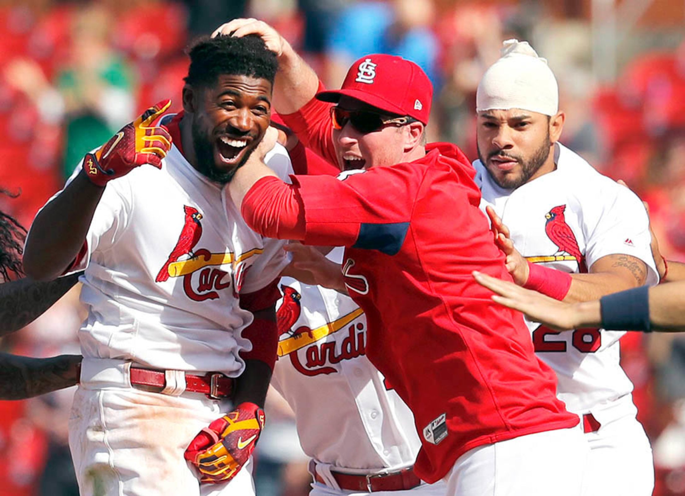 Thursday, April 26, at St. Louis - Cardinals 4, Mets 3 (13 innings): Celebrating good times and a 5-1 homestand, the club prevailed in walk-off fashion behind Dexter Fowler's single that brought José Martinez in for a safe landing at home and smiles all around. Jeff Roberson/AP Images
