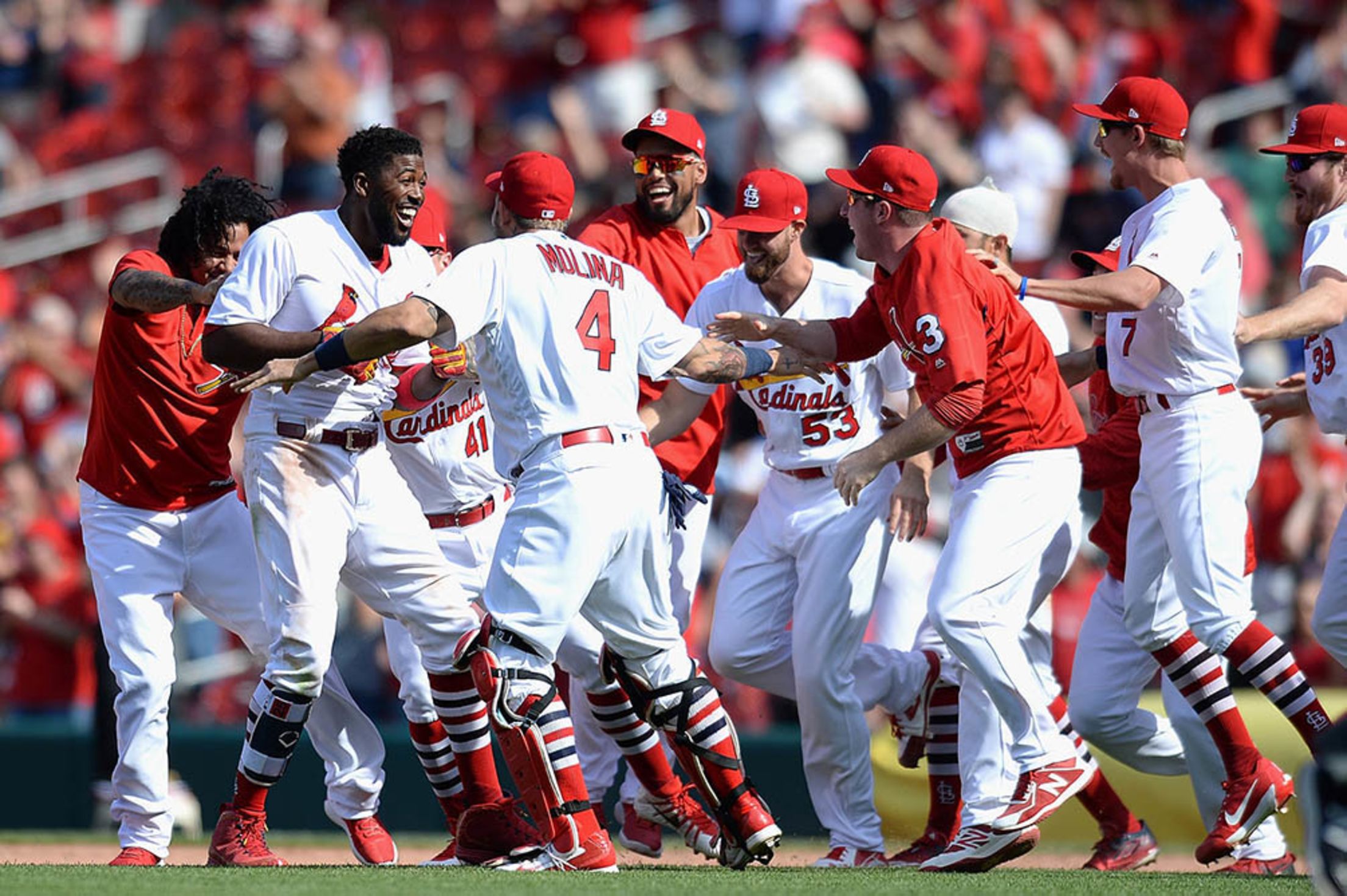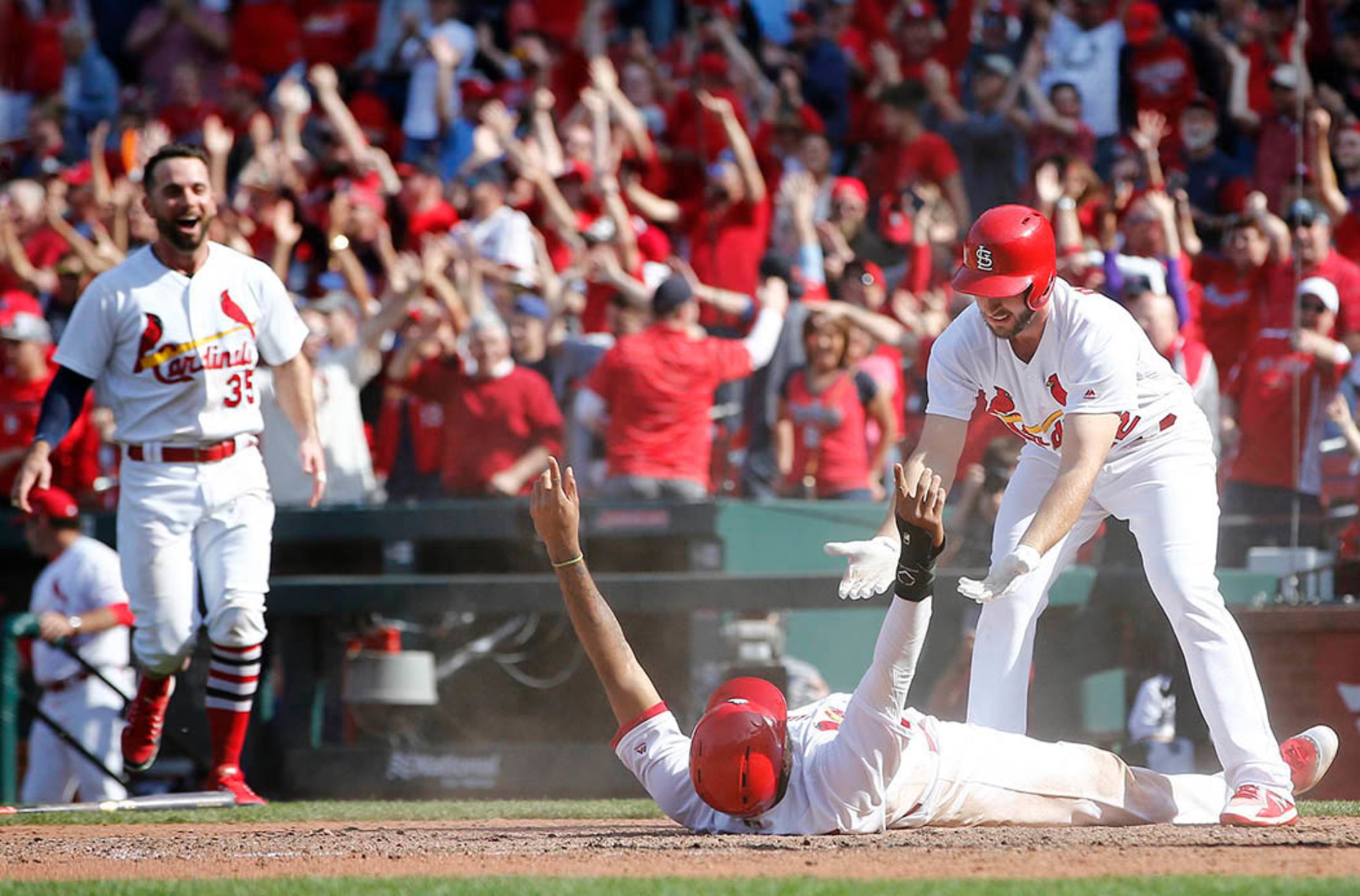 Thursday, April 26, at St. Louis - Cardinals 4, Mets 3 (13 innings): Celebrating good times and a 5-1 homestand, the club prevailed in walk-off fashion behind Dexter Fowler's single that brought José Martinez in for a safe landing at home and smiles all around. Billy Hurst/Cardinals