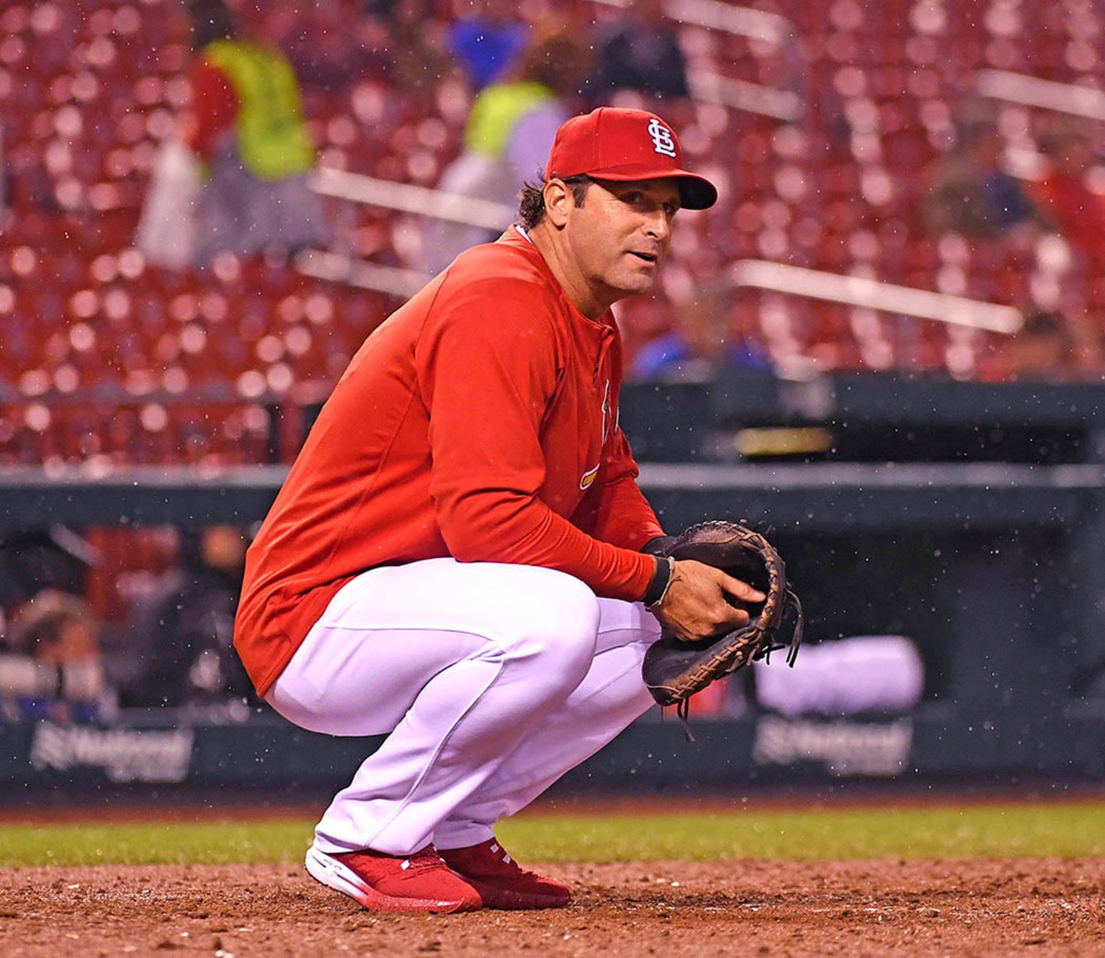 Wednesday, April 25, at St. Louis - Cardinals 9, Mets 1: Mike Matheny found a familiar perch, and dodged the raindrops, as he warmed up his pitcher. Scott Rovak/Cardinals