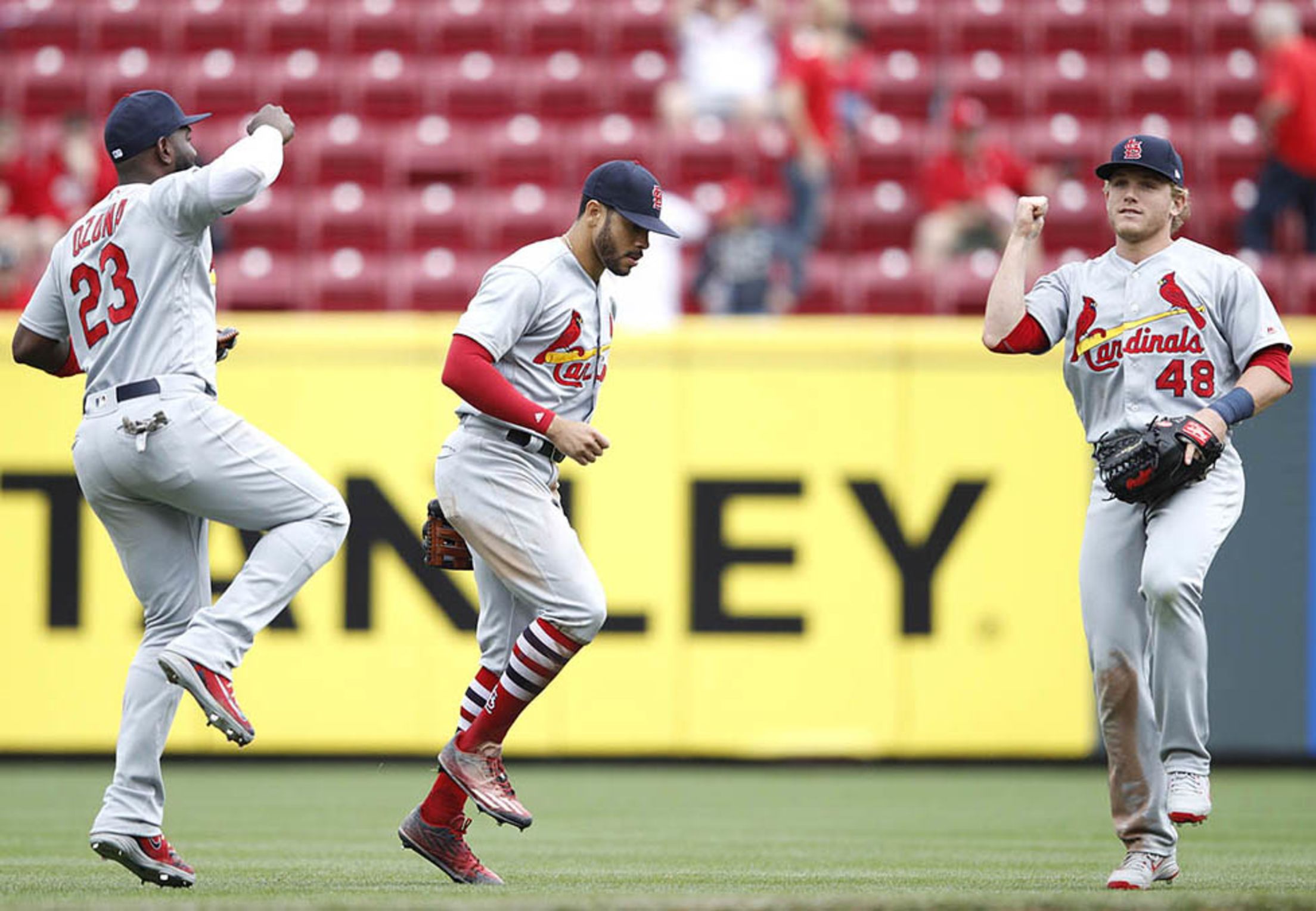 Saturday, April 14, at Cincinnati - Cardinals 6, Reds 1: (From left) Outfielders Marcell Ozuna, Tommy Pham and Harrison Bader celebrated the Cardinals' third consecutive victory, moving the club above .500 for the first time in 2018. Joe Robbins/Getty Images