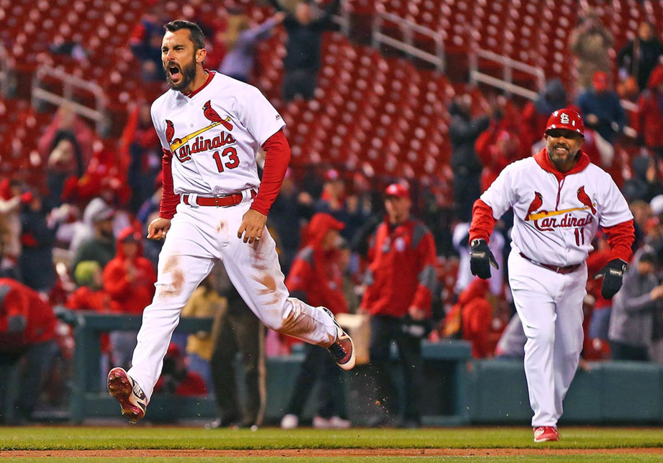 Tuesday, April 10, at St. Louis - Cardinals 5, Brewers 3 (11 innings): After an unsuccessful bunt attempt two pitches earlier, Matt Carpenter blasted a walk-off, two-run homer in the 11th to complete the Cardinals' dramatic victory after they rallied to tie the game in the ninth and 10th innings. Dilip Vishwanat/Getty Images