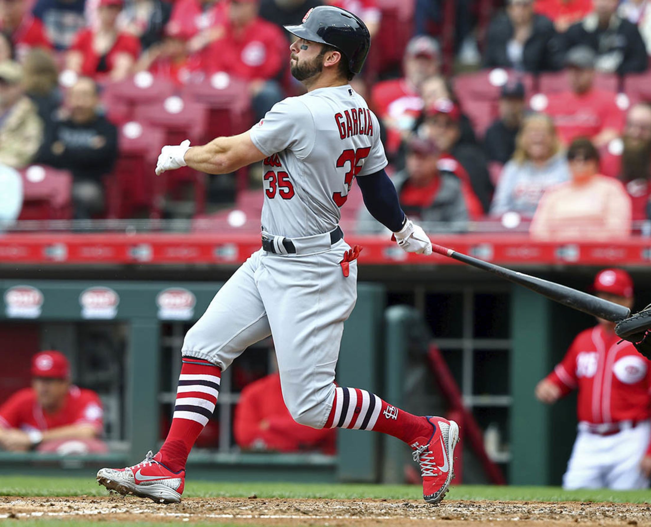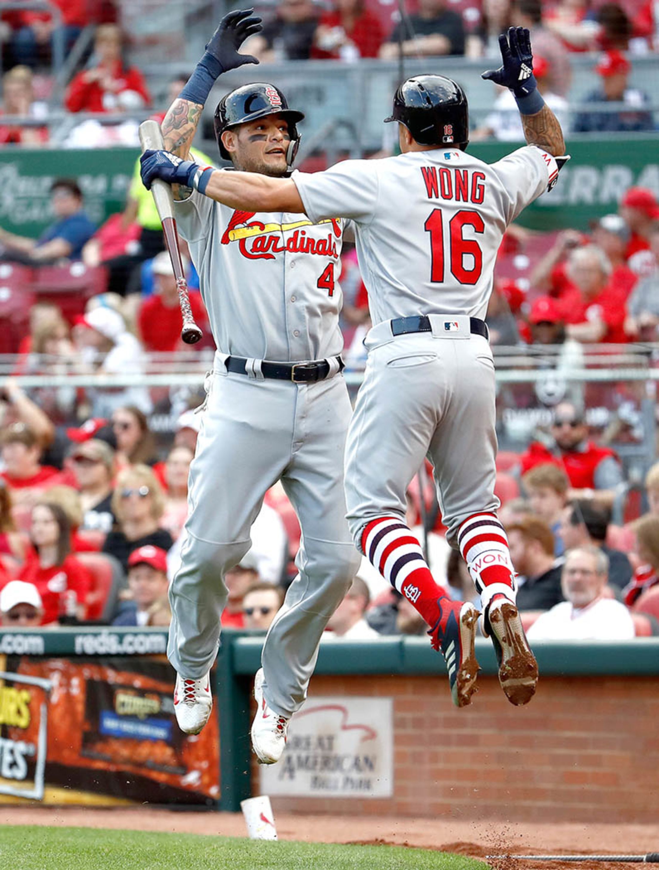 Friday, April 13, at Cincinnati - Cardinals 5, Reds 3: Yadier Molina's solo homer elevated him to a second-place tie on the majors' 2018 HR leaderboard with five. His two-run single in the sixth gave him 53 career RBIs at Great American Ballpark (paired with 14 homers and a .322 average). Andy Lyons/Getty Images