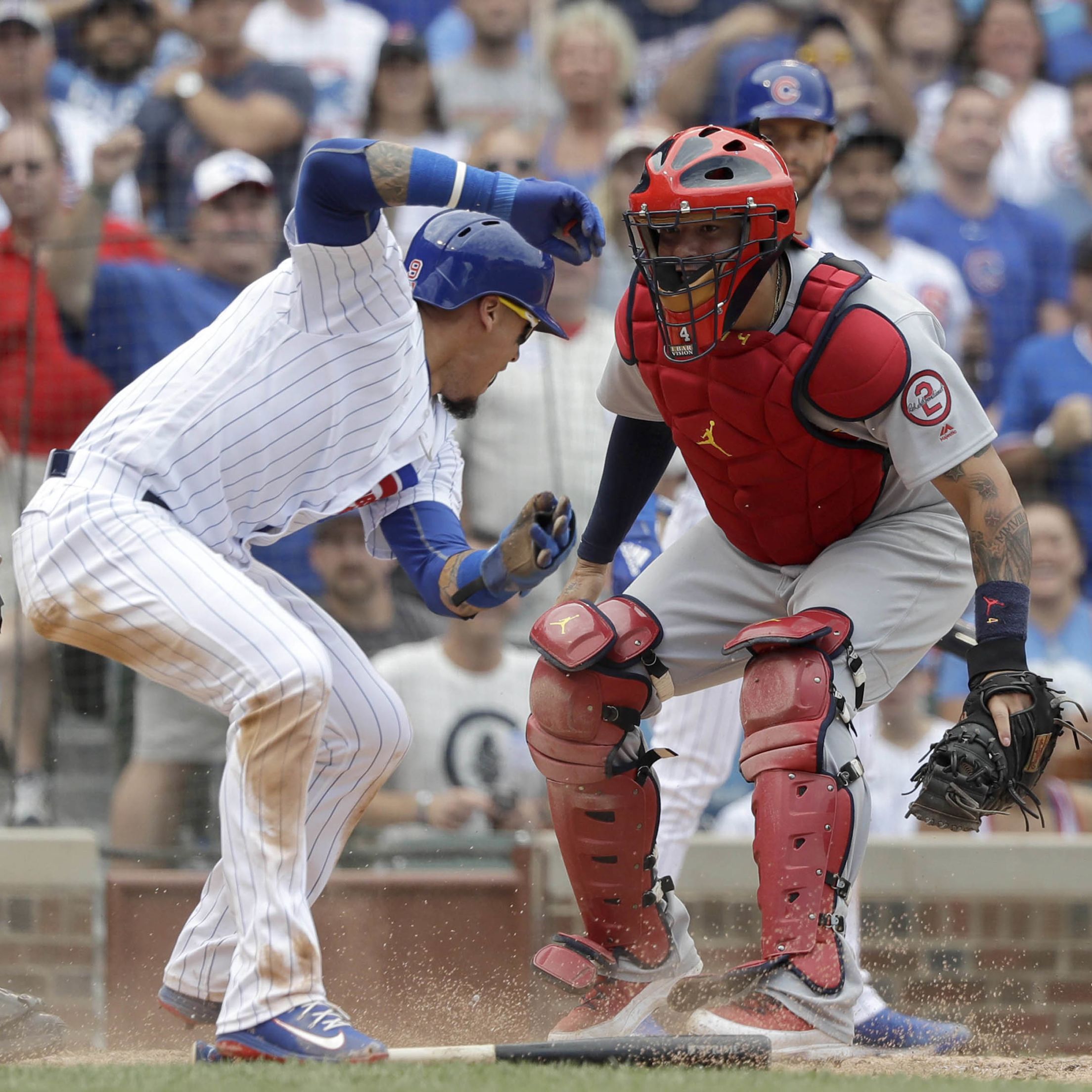 Saturday, July 21, at Chicago-Cubs 7, Cardinals 2 (Game 1): Javier Baez's failed attempt to avoid Yadier Molina's eventual tag after sliding past home plate as part of an inning-ending double play in the fifth provided a lighter moment during the five-game series at Wrigley Field. (Associated Press)