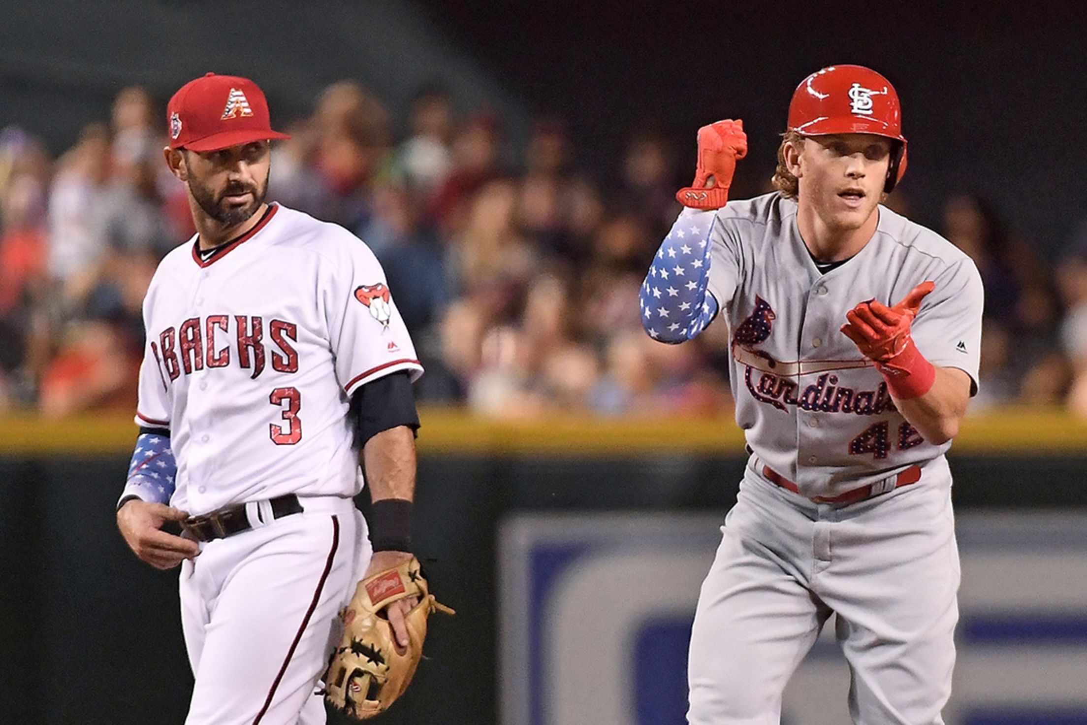Wednesday, July 4, at Arizona - Cardinals 8, Diamondbacks 4: Viewed from a different angle, a Birds on the Bat celebration doesn't look quite the same to former Cardinal Daniel Descalso. Jennifer Stewart/Getty Images