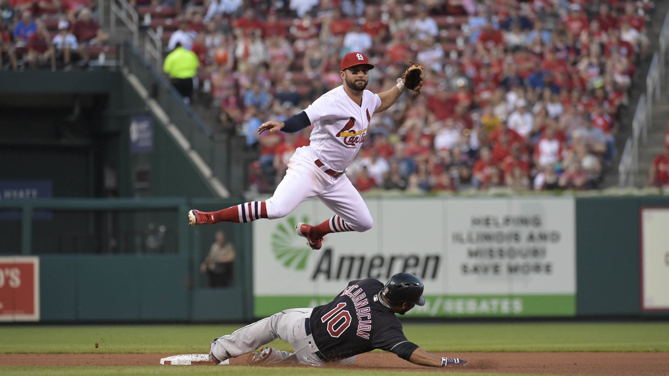Wednesday, June 27, Indians 5, Cardinals 1: A groundout helped Greg Garcia ensure Edwin Encarnacion-intentionally walked a batter prior-wouldn't cause any damage to the Cards in the third inning of Wednesday's matchup, though Encarnacion's teammate Francisco Lindor ultimately scored on the play. Scott Rovak/St. Louis Cardinals