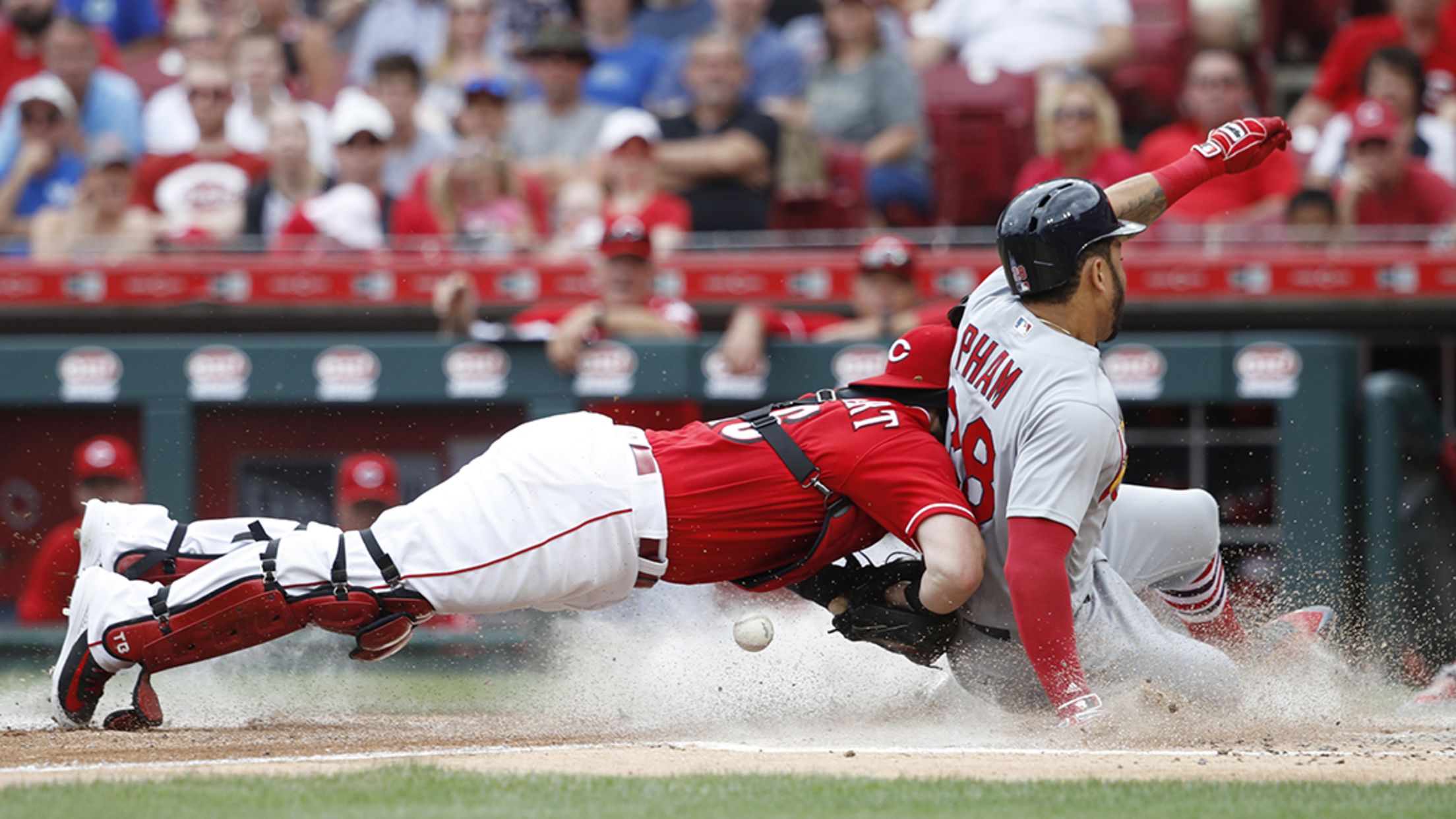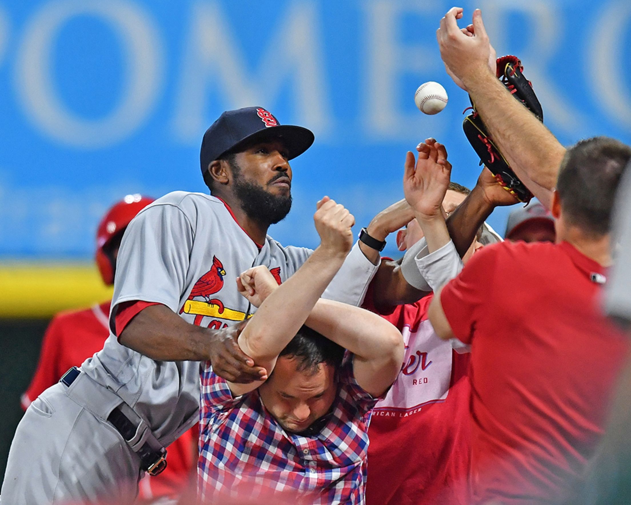 Friday, June 8, at Cincinnati-Cardinals 7, Reds 6 (10 innings): No one made the catch on Alex Blandino's sixth-inning foul ball, but Dexter Fowler got to rub elbows with some of the front-row patrons at Great American Ball Park. Jamie Sabau/Getty Images