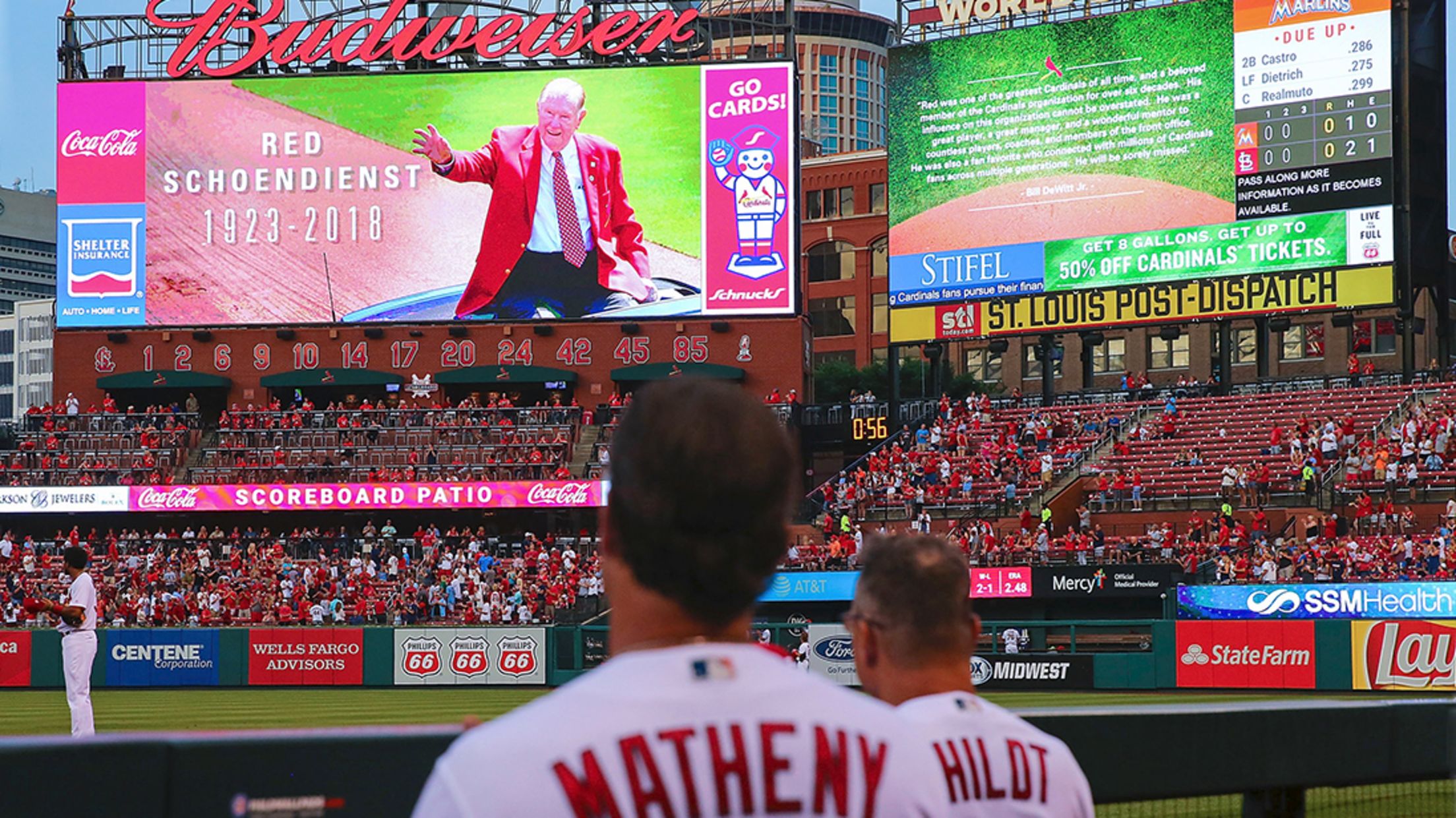 Wednesday, June 6, at St. Louis - Marlins 11, Cardinals 3: When the club announced the sad news of Red Schoendienst's passing, all at the ballpark stood prior to the third inning and warmly saluted the Hall of Famer in remembrance of his remarkable ride through 71 years in the Cardinals organization. Dilip Vishwanat/Getty Images