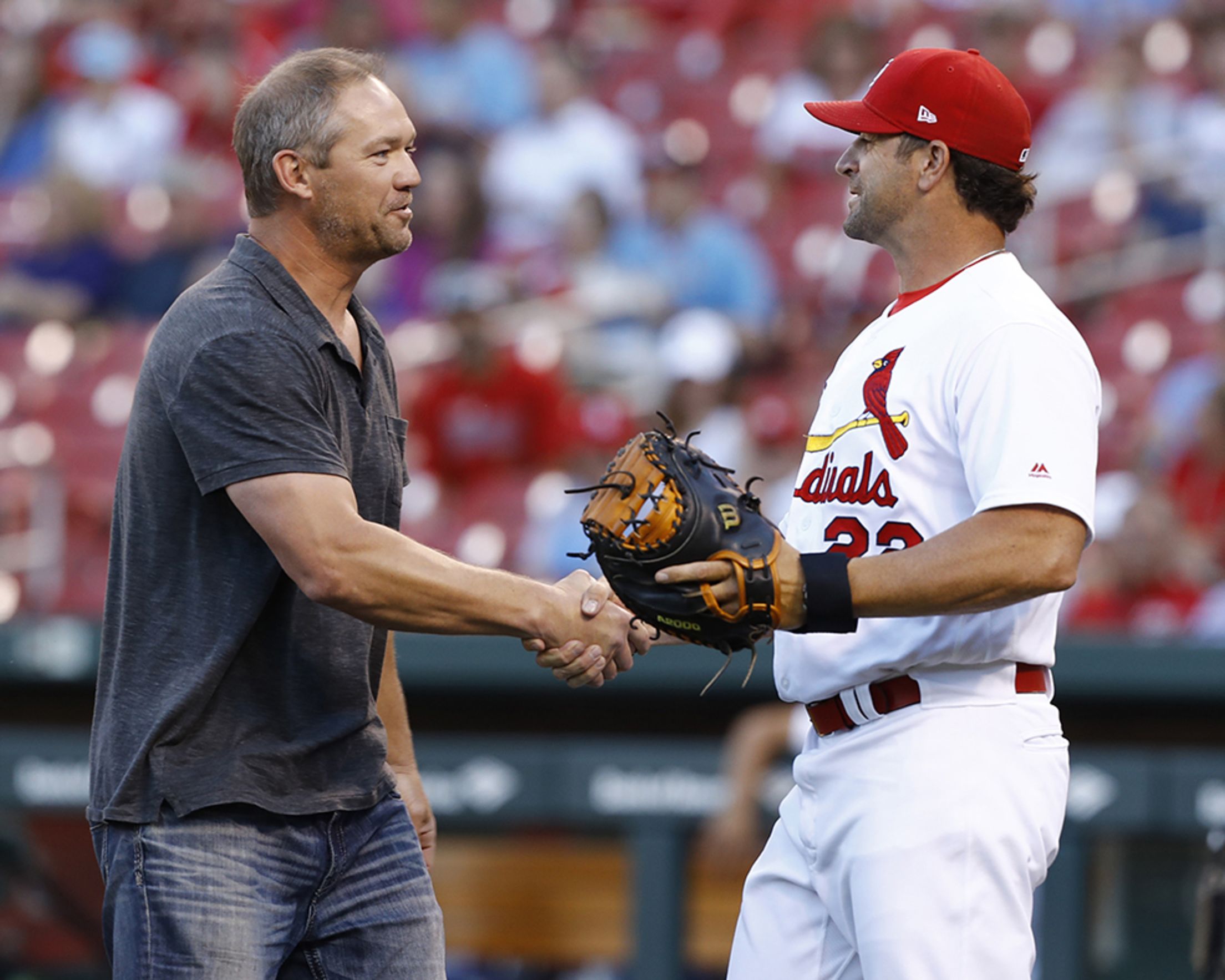 Tuesday, June 5, at St. Louis - Marlins 7, Cardinals 4: Cardinals manager Mike Matheny dusted off his catcher's mitt to receive a ceremonial first pitch by former teammate Scott Rolen, in town for a Budweiser Bash theme night at the ballpark. Billy Hurst/Cardinals