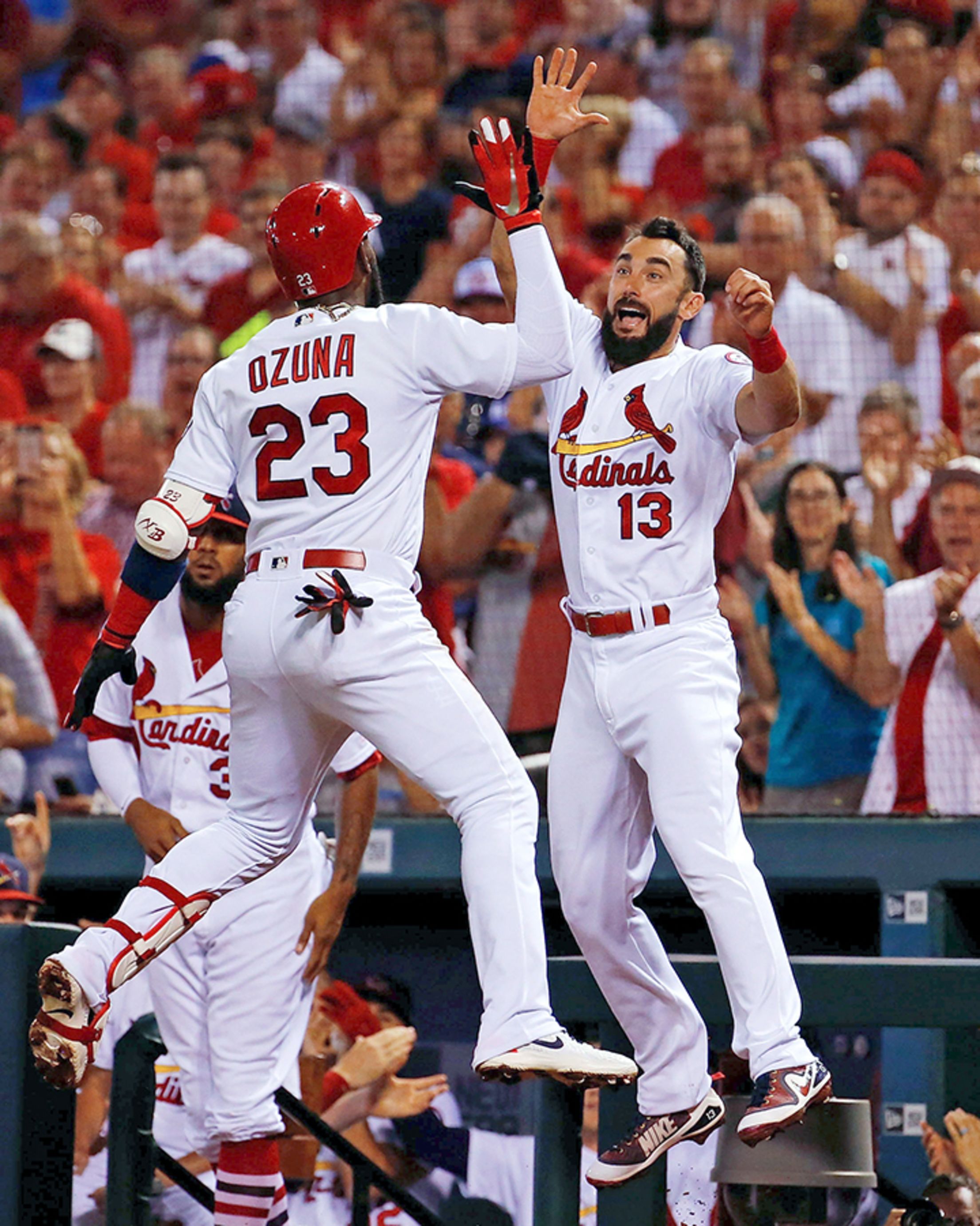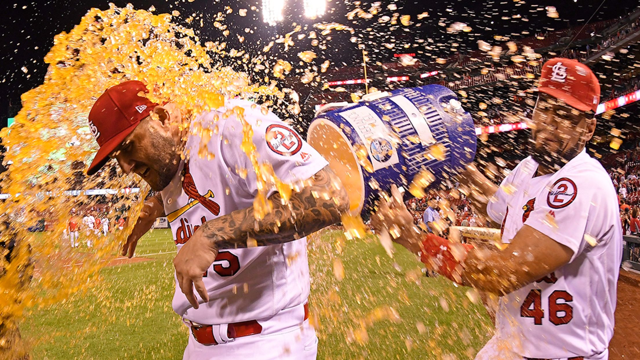 Monday, Sept. 10, at St. Louis - Cardinals 8, Pirates 7: Teammate Francisco Pena provided the perfect postgame potion for Adams' bucket-list moment. (Scott Rovak/Cardinals)