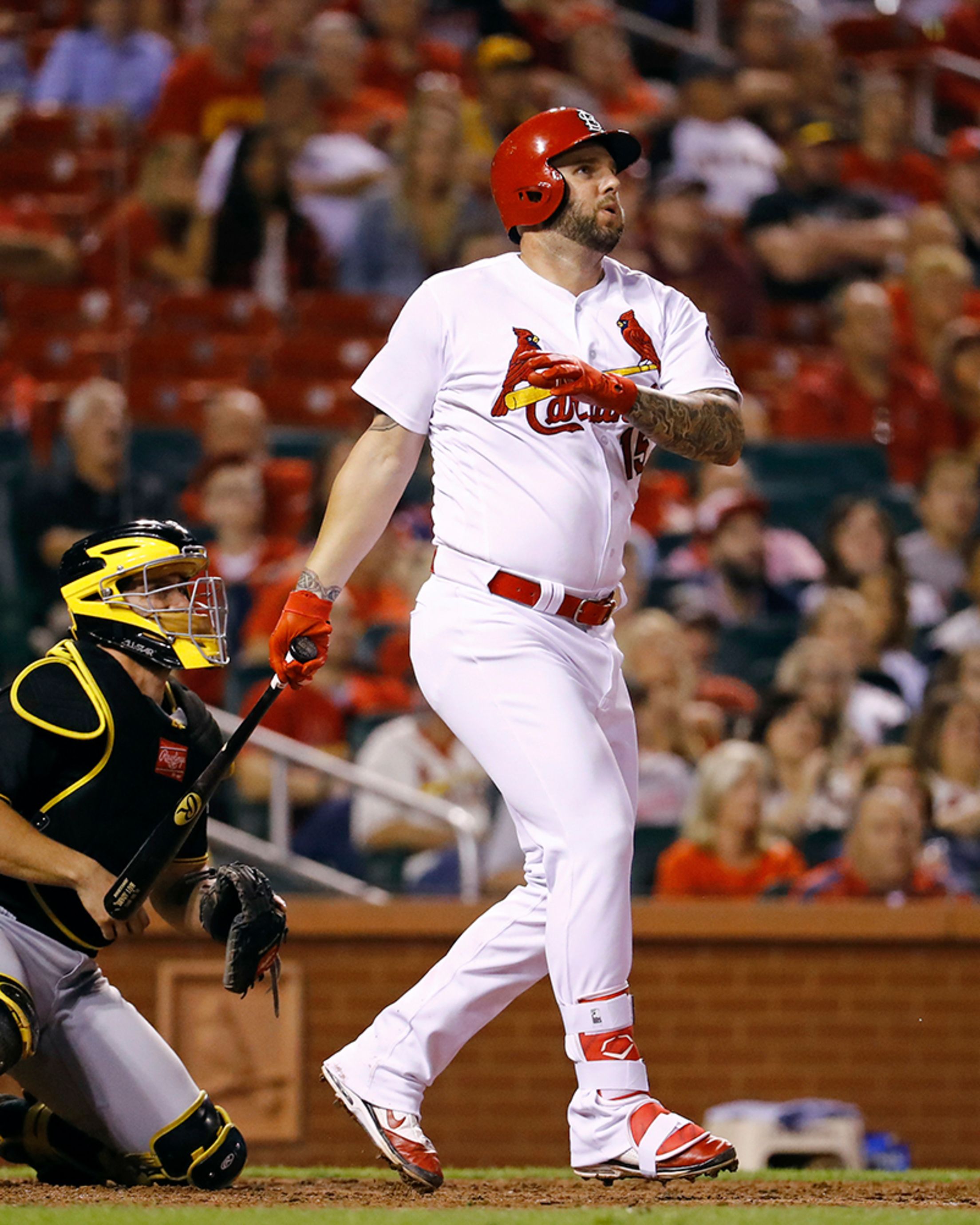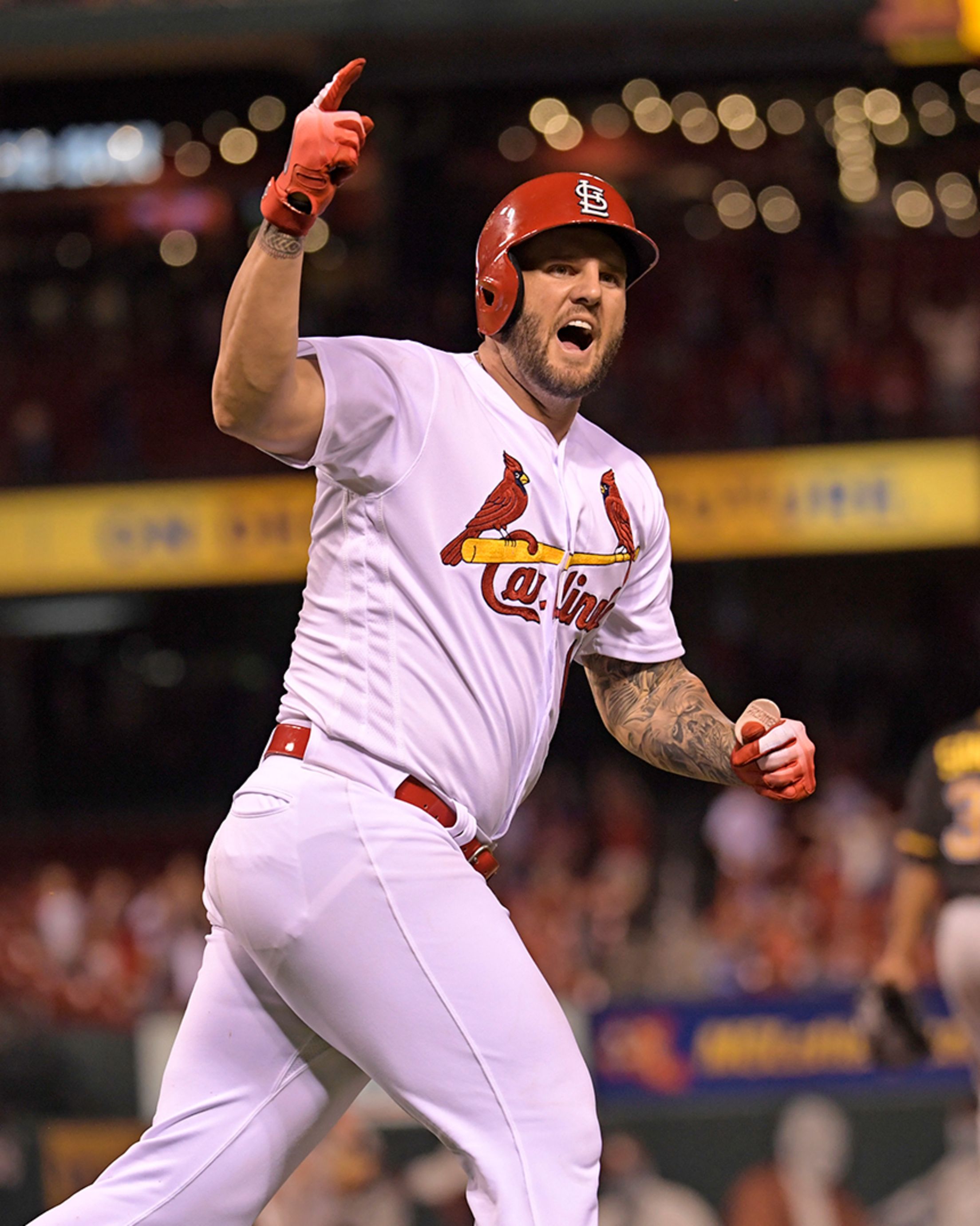Monday, Sept. 10, at St. Louis - Cardinals 8, Pirates 7: Bashing his third homer in 13 at-bats and his first at Busch since rejoining the Birds on the Bat, Matt Adams celebrated a three-run shot that erased a 6-4 deficit in the eighth inning. (Left: Billy Hurst/Cardinals; Right: Scott Rovak/Cardinals)