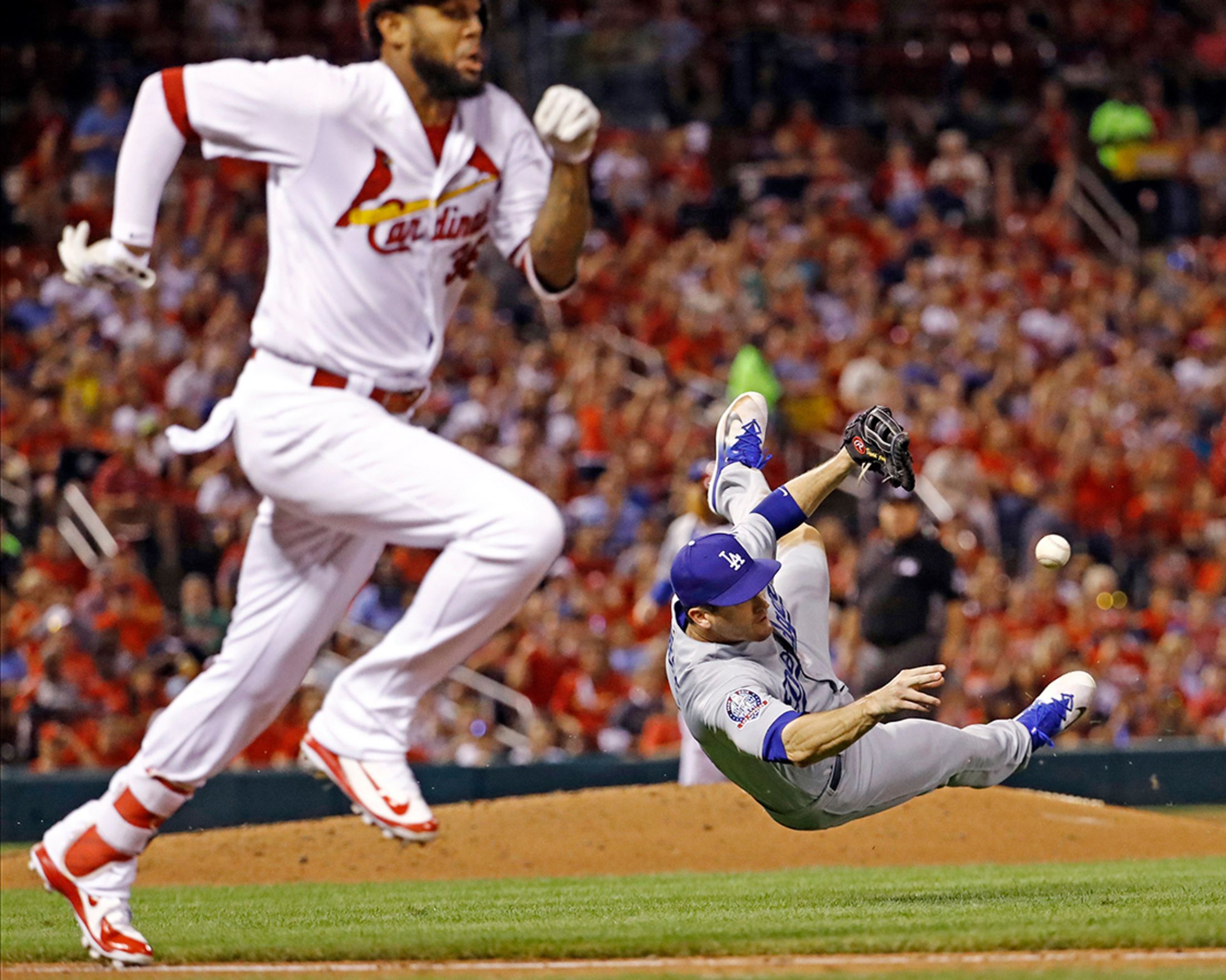Thursday, Sept. 13, at St. Louis - Dodgers 9, Cardinals 7: A seven-run deficit (8-1 in the fifth) didn't keep Jose Martinez from hustling to first on a ground ball misplayed by new Dodger David Freese during a three-run inning for the Redbirds. (Billy Hurst/Cardinals)