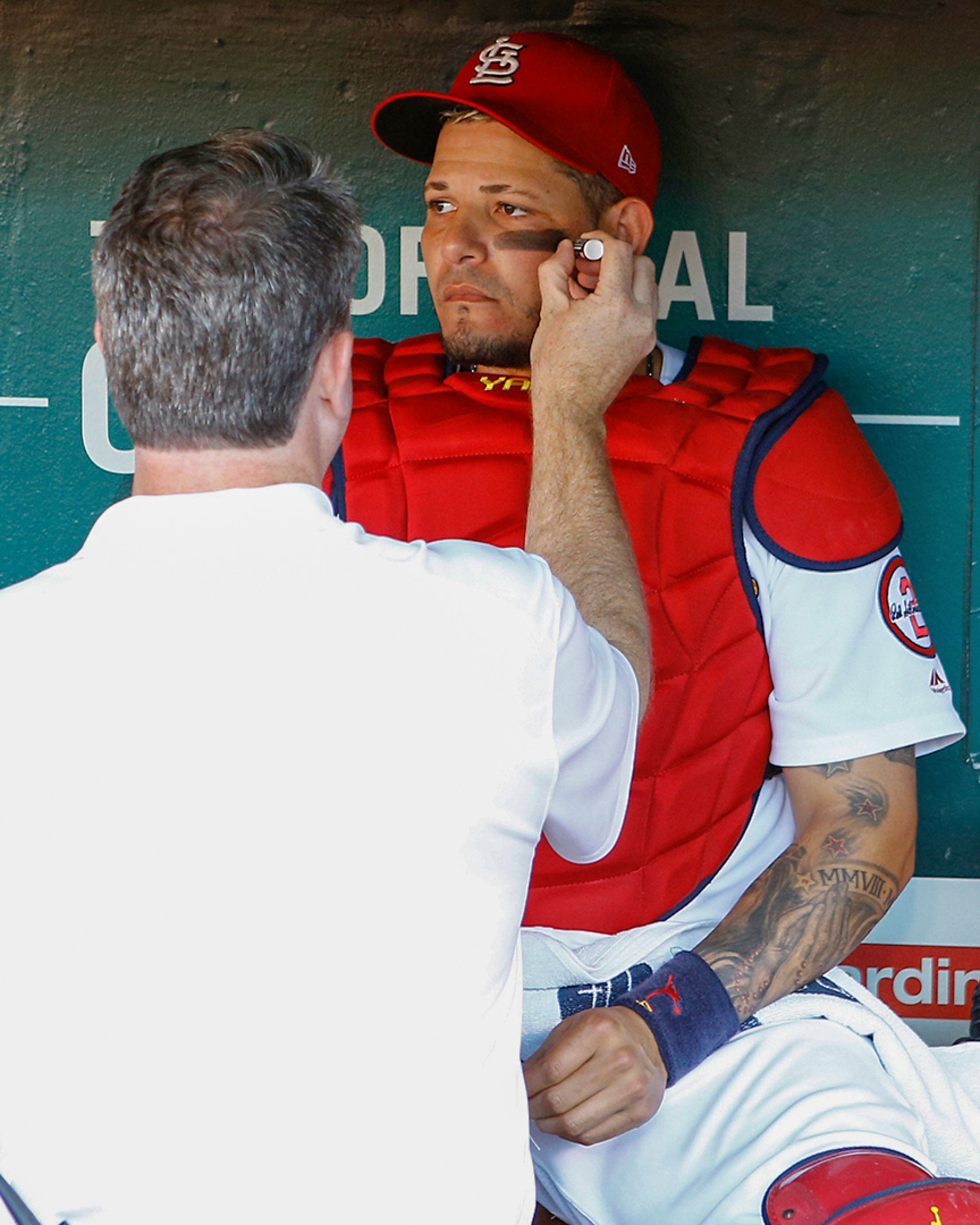Thursday, Sept. 13, at St. Louis - Dodgers 9, Cardinals 7: Returning to the lineup for the first time since suffering a strained hamstring on Sept. 5, Yadier Molina got his game face ready for the start of a four-game series against L.A. (Billy Hurst/Cardinals)