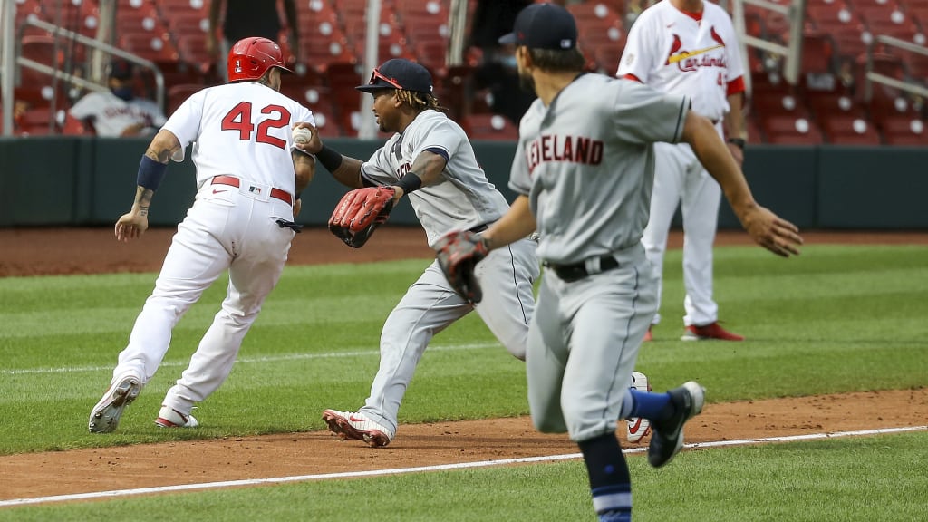 Molina stopped between third base and home plate, motioning that it was a foul ball. Santana ran toward the Cardinals’ catcher, then threw it to Cleveland third baseman José Ramírez, who tagged Molina out.