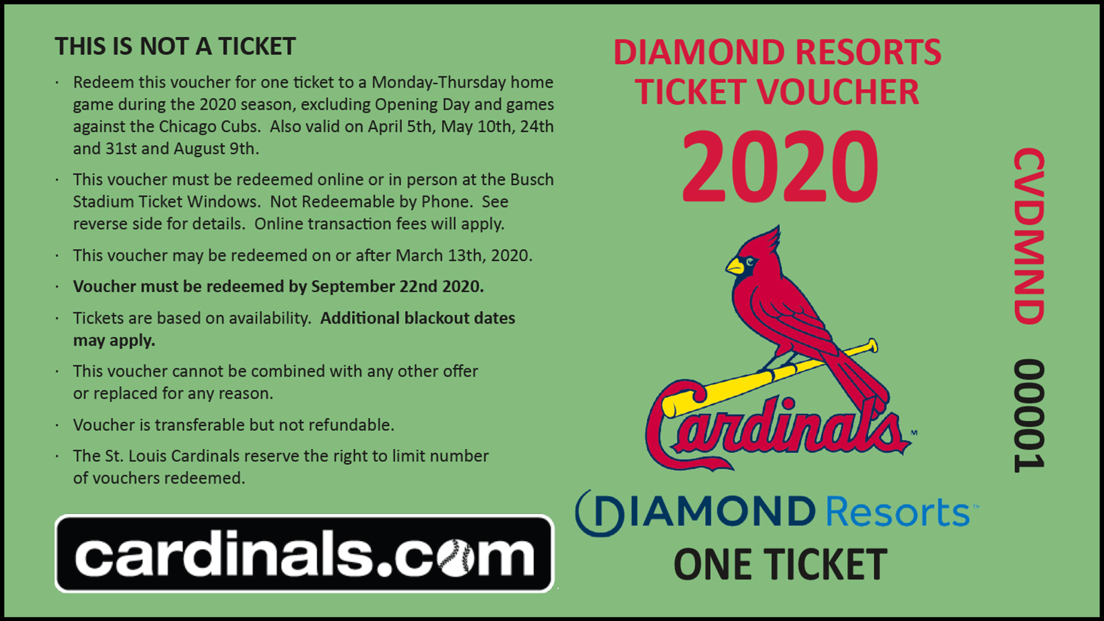 Diamond Resort members may redeem this voucher for a ticket to a select 2020 Cardinals home game. To redeem your ticket voucher, simply click on the "Redeem Voucher" button below, enter the password found on your voucher(s), and follow the instructions on the buying page.