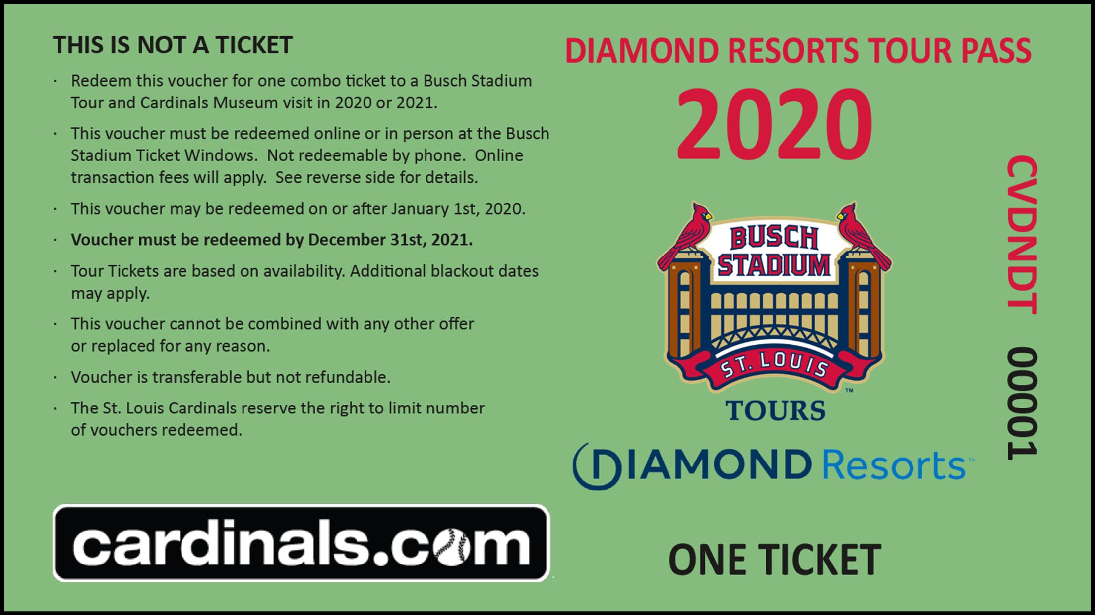 Diamond Resort members may redeem this voucher for a ticket to a Busch Stadium Tour and Cardinals Hall of Fame and Museum Visit. To redeem your tour voucher, simply click on the "Redeem Voucher" button below, enter the password found on your voucher(s), and follow the instructions on the buying page.