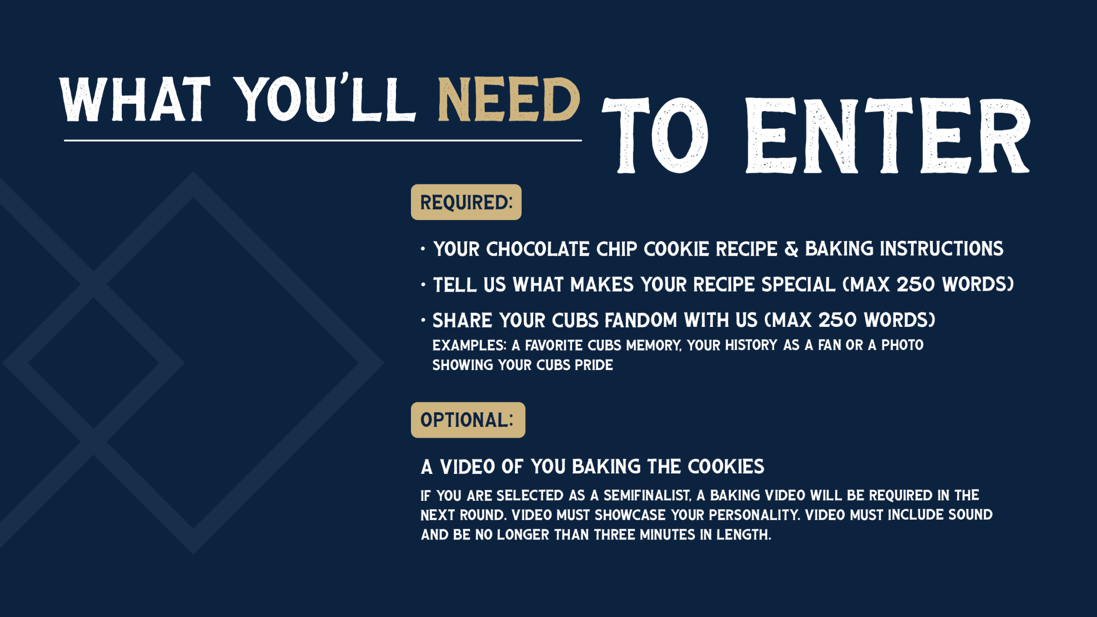 We’re on the hunt for the Cubs fan with the best chocolate chip cookie recipe.The winning cookie could be served at Wrigley Field during the Cubs 150th Anniversary Celebration, pairing an American classic with America’s favorite pastime. So, dust off your aprons, fire up those ovens and share your best chocolate chip cookie recipe with us. We can’t wait to see which Cubs fan claims the title.