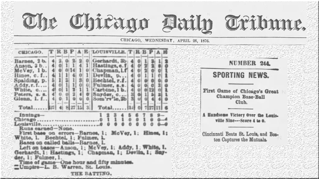 (The Tribune also began its game story like this: "When this city entered the professional base-ball business it was done with rather more judgement than is usual in first adventures, and the nine was picked out with rather more good sense than is usual in like cases. When Chicago, warned by many failures, undertook her present team, it was proper that it be a strong one." You don't see baseball writing like that anymore.)