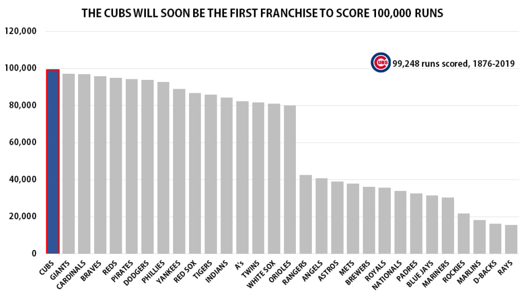 In between those two tallies, over nearly 150 years, seven stadiums, two world wars, and with more than 2,000 players wearing the uniform, the Cubs have scored an additional 99,246 regular-season runs, which means they're a mere 754 tallies from being the first team in baseball history to reach a very round number. When the Cubs next get an opportunity to play a full season, they will almost certainly become the first franchise in Major League Baseball history to reach 100,000 total team runs scored.