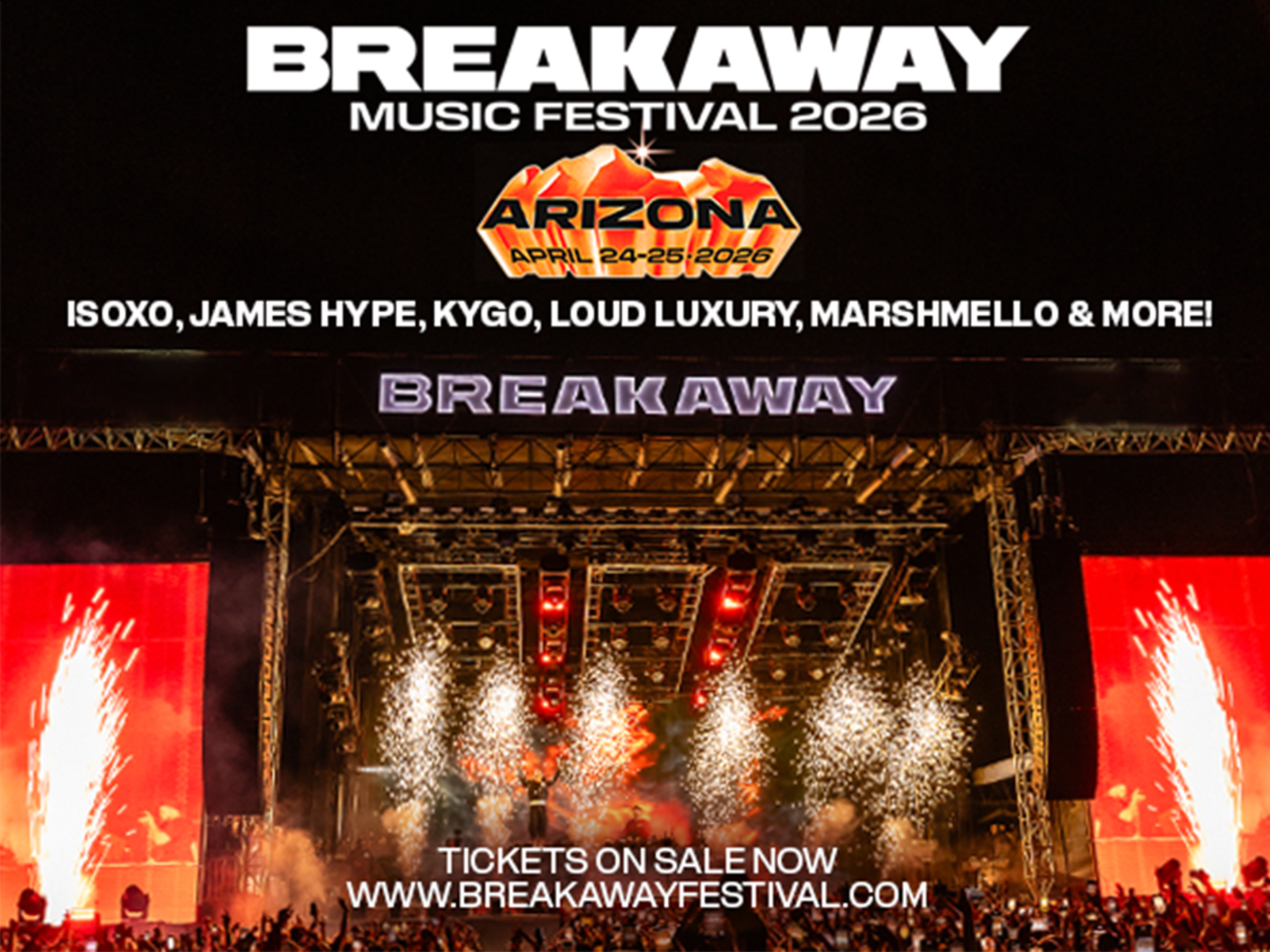 After an electrifying Arizona debut last year, Breakaway Music Festival returns April 24–25, 2026, bringing two days of live music and festival energy back to Mesa.