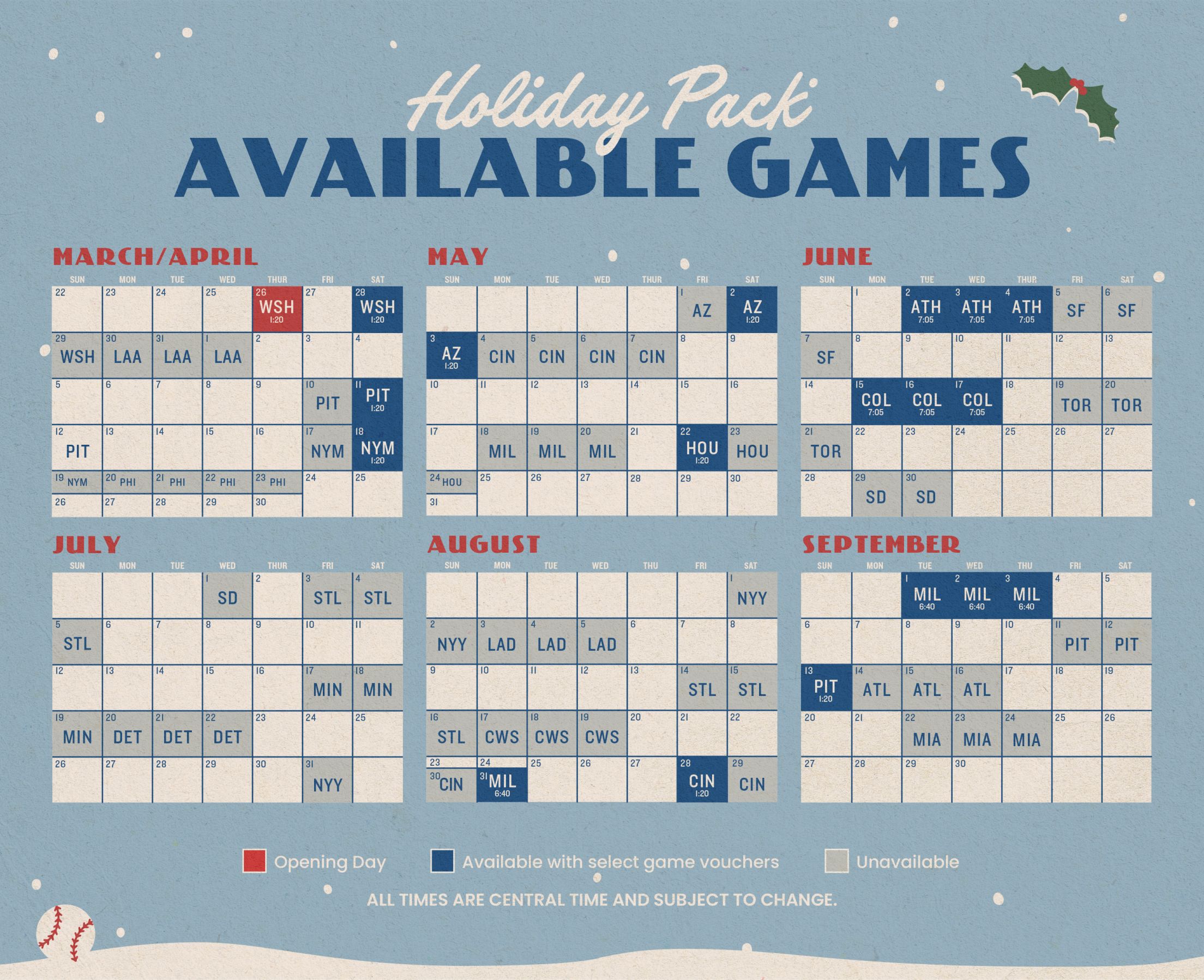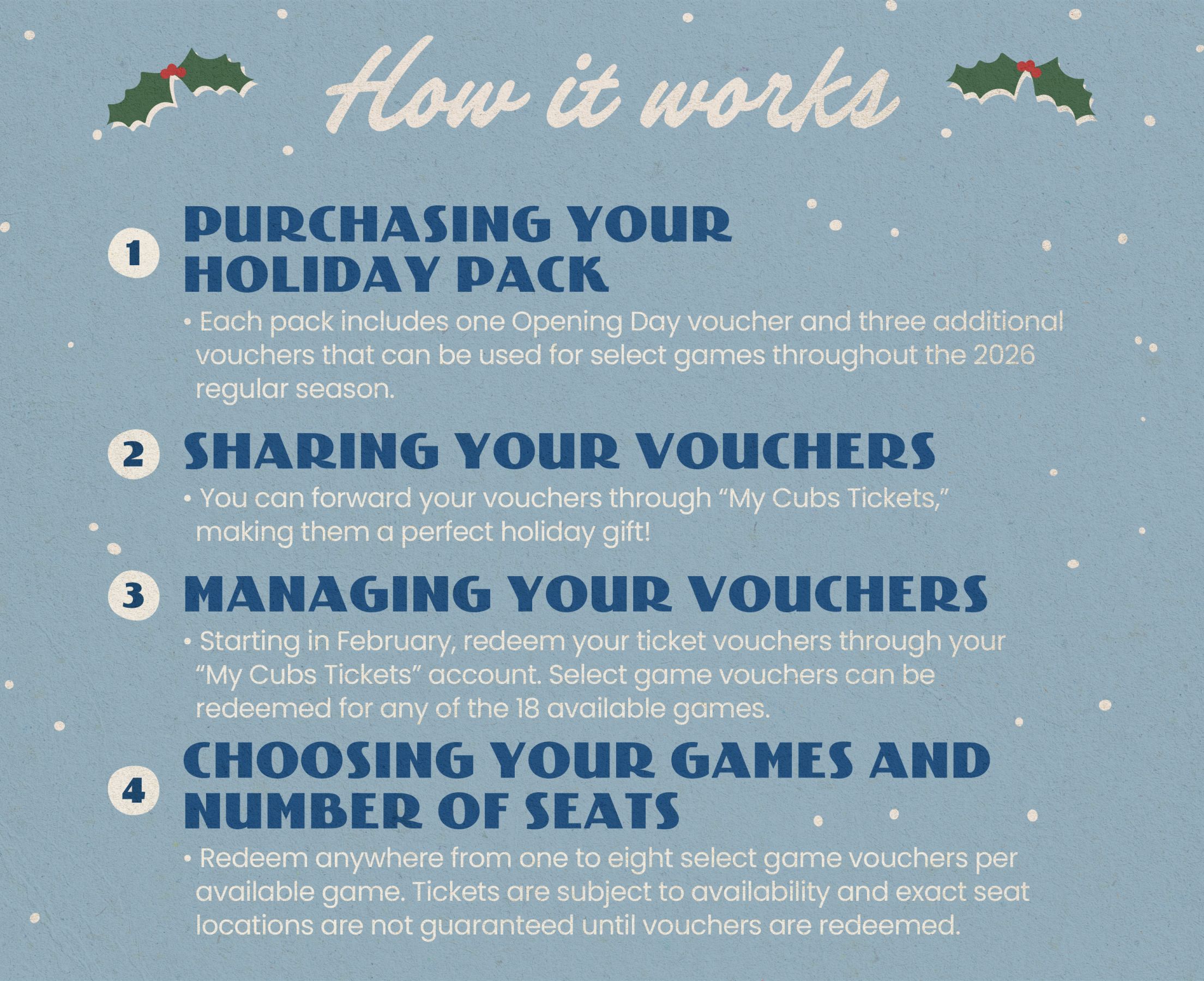 Each Holiday Pack includes one voucher for Opening Day at Wrigley Field and three additional vouchers for select games throughout the 2026 regular season, offering the flexibility to choose games at a later date.