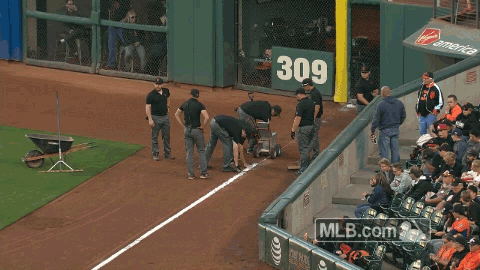 The Giants' grounds crew had to make an emergency foul-line repair on Monday