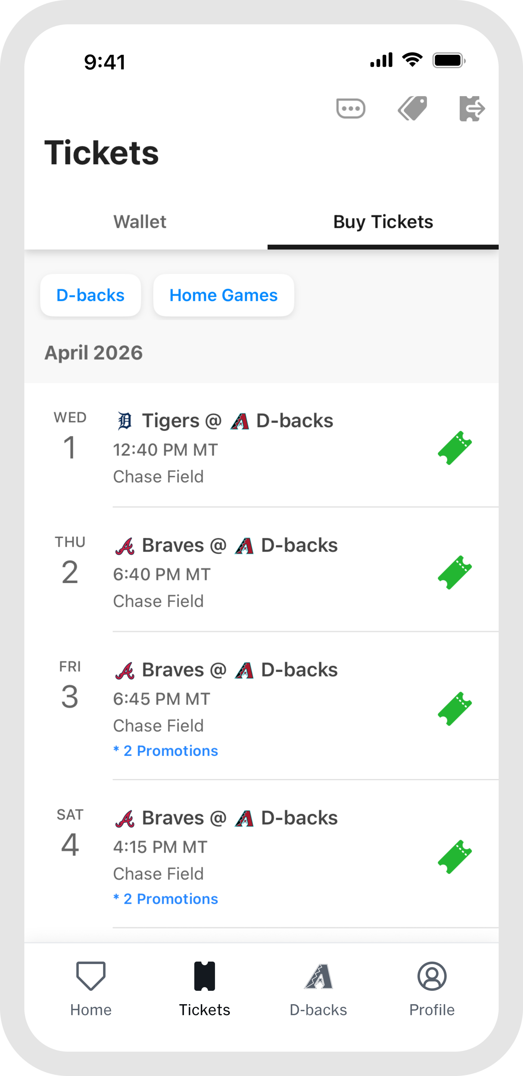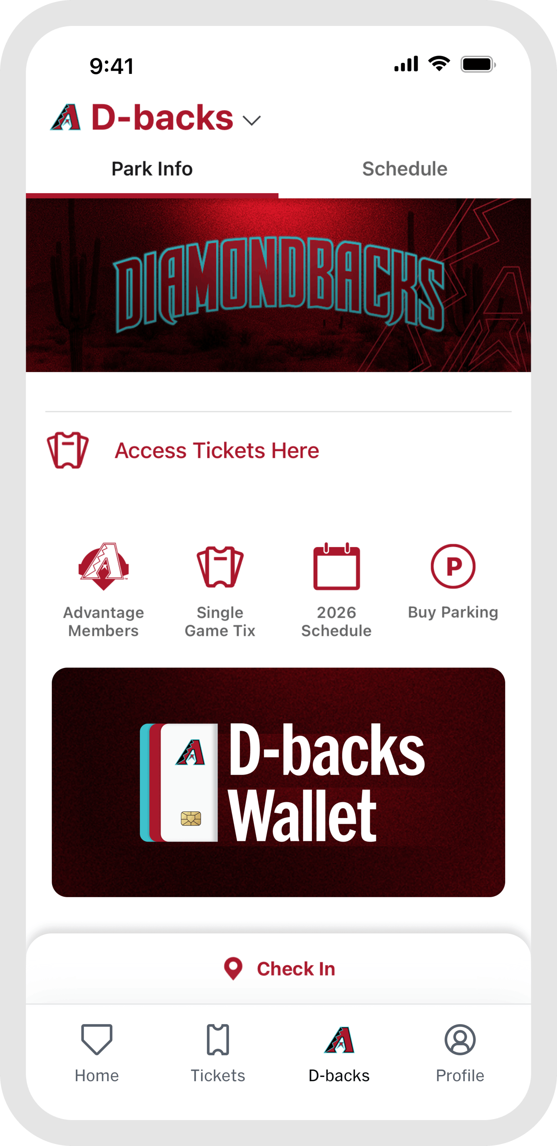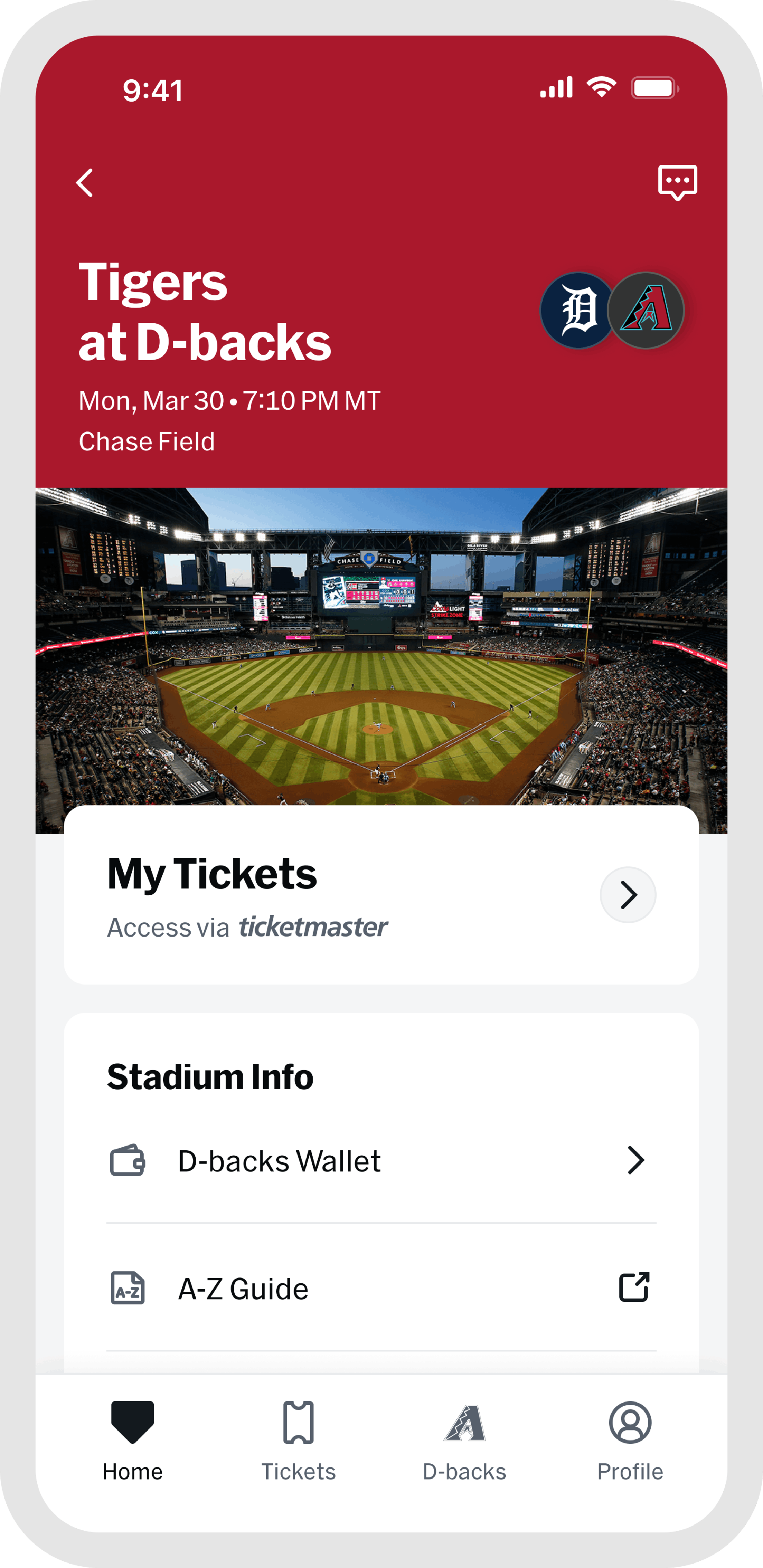 Once you are at the game, the "Home" and "D-backs" tabs are your go-to for everything venue-related. Browse stadium maps, jump into interactive games, find concession info, and access in-game features all designed to make your experience better from first pitch to final out. When the game wraps up, head to "My History" in the "Profile" tab to revisit every game you have attended, all in one place.