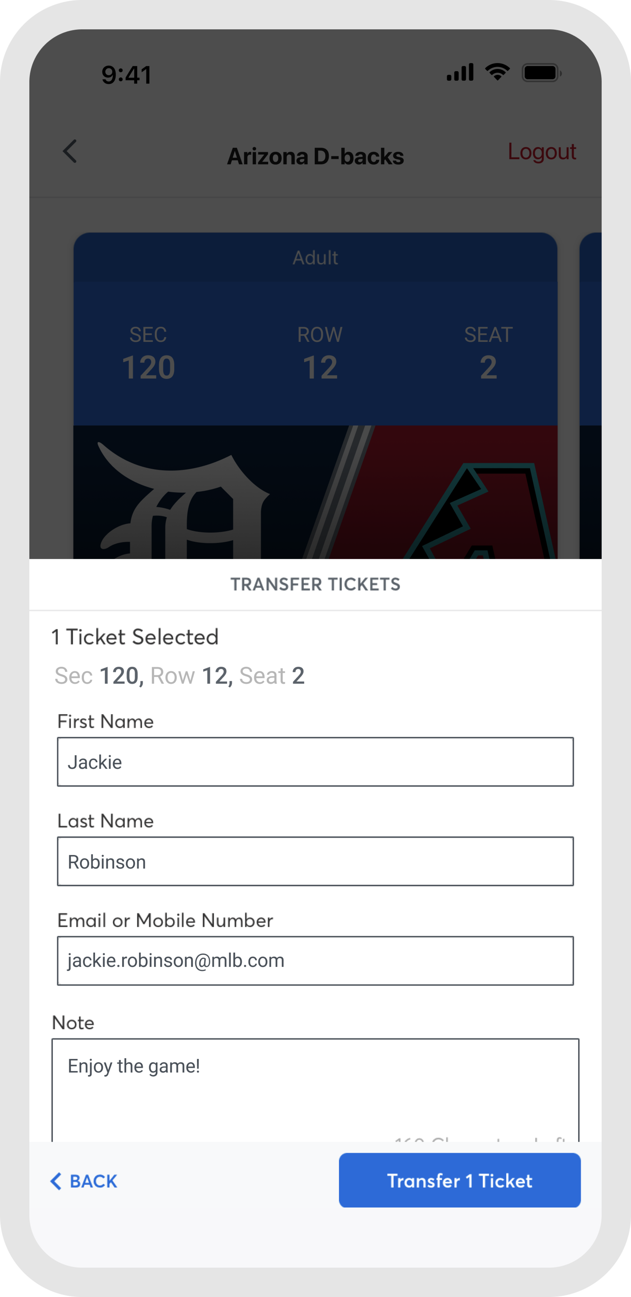Head to the "Tickets" tab, tap "Wallet," and select the game you are attending. From your ticket list, tap the forward button and choose which tickets to send.