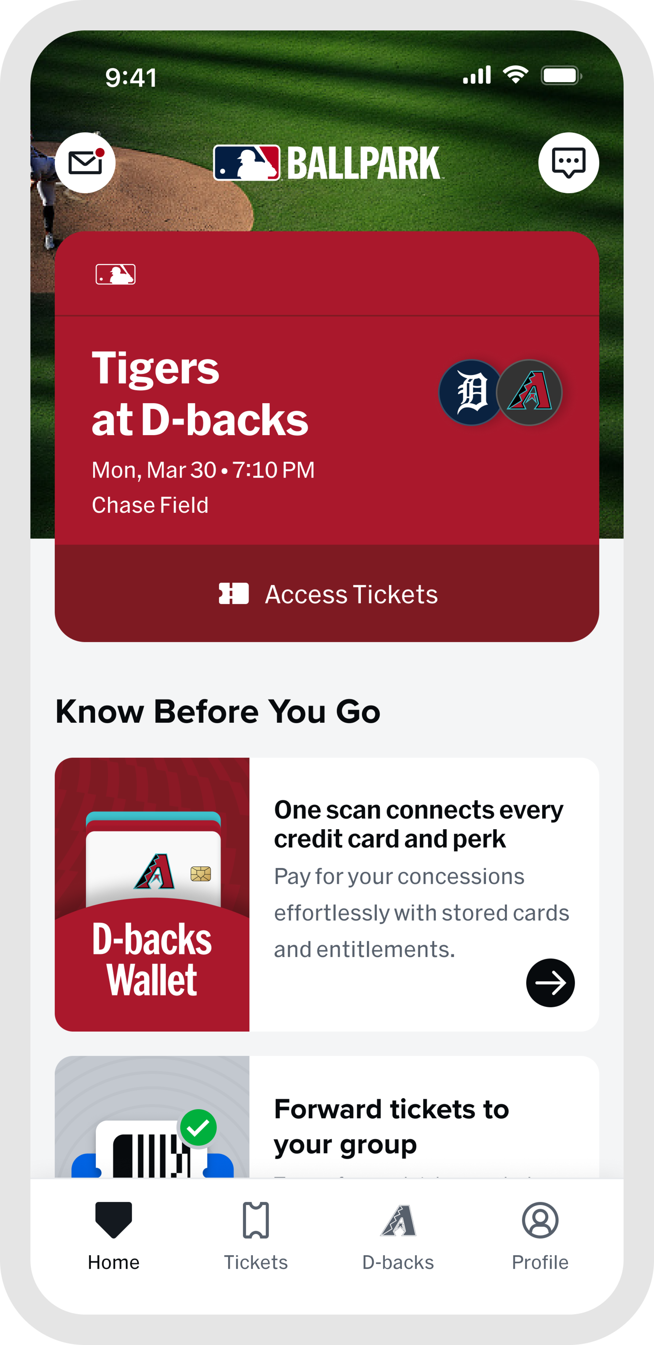 D-backs Wallet provides a seamless way for fans to manage their ticket entitlements and concession credit in one centralized wallet experience. D-backs Wallet is available to fans using the MLB Ballpark app at Chase Field concession and retail locations, some restrictions may apply based on the credit or discount. Please see Terms of Use and Privacy Policy for more information.