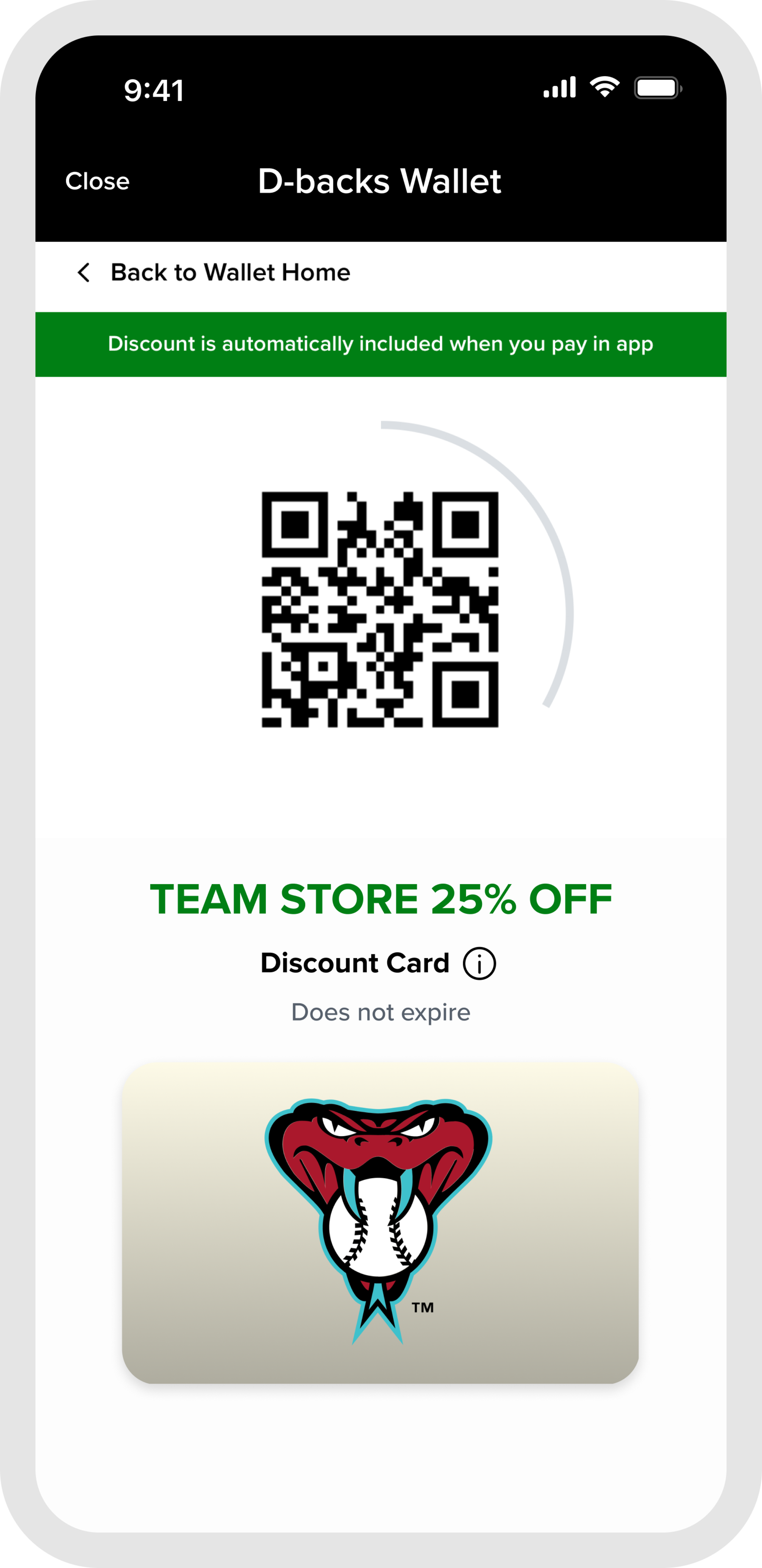 Select the D-backs Wallet card on the Home Tab or the D-backs Wallet tile on the Team Tab