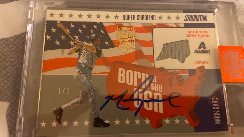 Grace, as can be seen on the card, was born in North Carolina, and he is shown here in a D-backs uniform. He spent most of his career with the Cubs (1988-2000), but it was with Arizona that he won his only World Series ring in 2001.