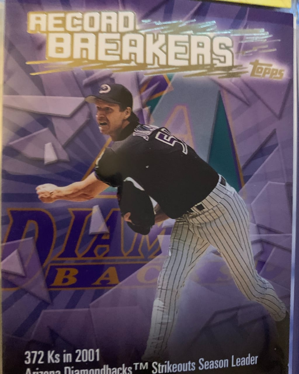 The Big Unit broke a lot of records in his day. So this card commemorating his franchise-record 372 strikeouts in 2001 with the appearance of shattered glass is appropriate.