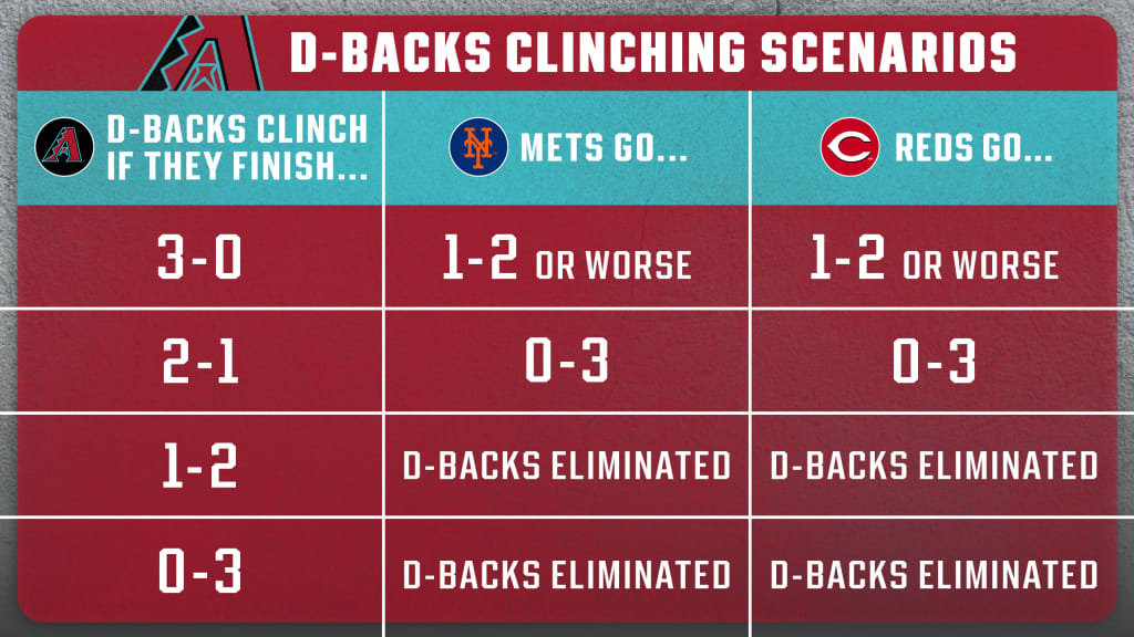 With the worst record of the three teams, the D-backs need a lot of help to get in. Even if they sweep the Padres, they’d still need both the Mets and Reds to go 1-2 or worse in their series. If they go 2-1, they’d need each of New York and Cincinnati to get swept.