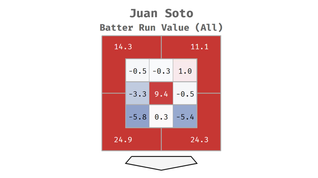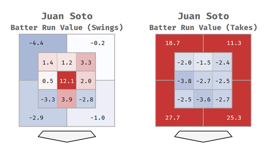 In Soto’s case, maybe it’s more instructive to show the run value on all pitches, no matter what he does on them. If you throw it out of the zone, he wins. If you throw it right down the middle, he wins. If you want to beat him, all you have to do is dot the edges with nasty stuff. No big deal, right?
