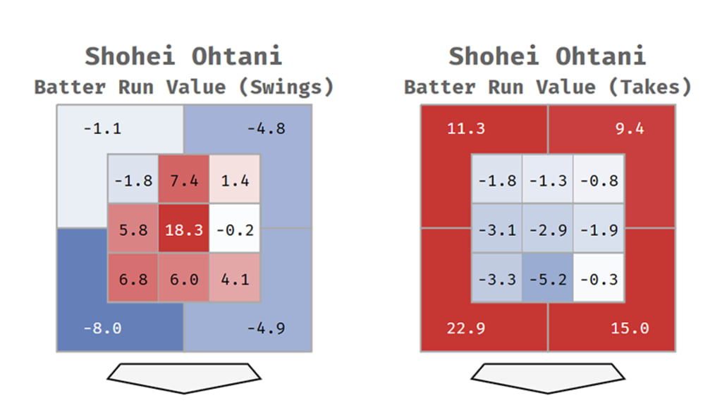 The problem is, there’s not an obvious answer. He’s great at takes outside the zone, piling up top-10 value there (+59 runs). He’s great at swings in the zone, second only to Judge with +48 runs. But even Judge and Soto have at least one somewhat weaker area, and Ohtani doesn’t, not really. The -2 when he swings up-and-away? Big deal, basically. You can do better if you get him tight and inside, it’s just that nowhere is great.
