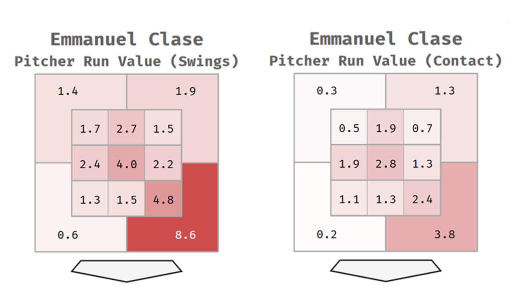 Clase, however, didn’t rate poorly. He was actually a positive when failing to get a miss in the zone, at +10. (Which somehow rates second-best behind Detroit’s Tyler Holton.) For most pitchers, this is a huge problem. For Clase, it’s a strength. If it’s bad for the batter when he swings against Clase (+35 runs, from pitcher’s POV) and bad when he makes contact (+14 runs) and somewhere near 50/50 when he doesn’t swing (-4 for Clase, or +4 for the batter), maybe the swings aren’t all worth it -- unless you’re Aaron Judge?