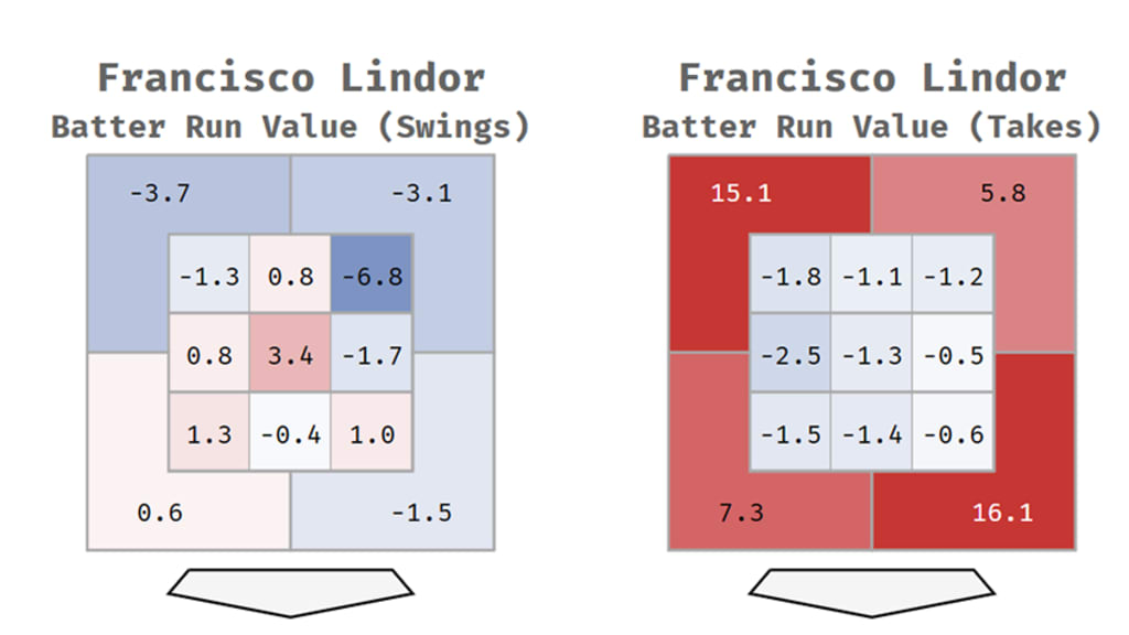 Lindor took nearly three times as many plate appearances from the left side as he did the right side, so it’s expected that the spread in numbers would be smaller here, but it also makes what happened here stand out. Righty Lindor hunted middle-middle and middle-in pitches that he could damage, and Righty Lindor’s pull rate of 49% was considerably higher than Lefty Lindor’s 44%.