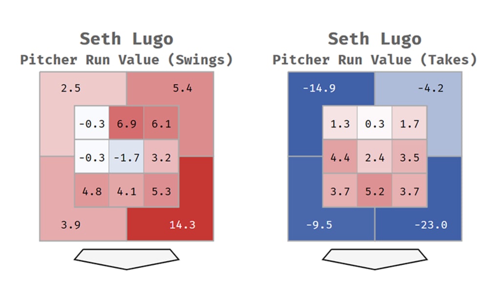 Would you believe that Lugo, who at 34 was in his second year back in the rotation after years in the bullpen, led the entire Majors in in-zone run value, at +52 runs, just ahead of Skubal, Zack Wheeler, Hunter Greene, and Cole Ragans? He was tied for second in value on in-zone swings (+28), and was sixth in value on in-zone takes (+26), and he did that with only two pitches that “stuff” metrics would call plus, his high-spinning curve and slider. His fastballs, by the eye test and metrics, are “fine,” and really more complimentary pitches.