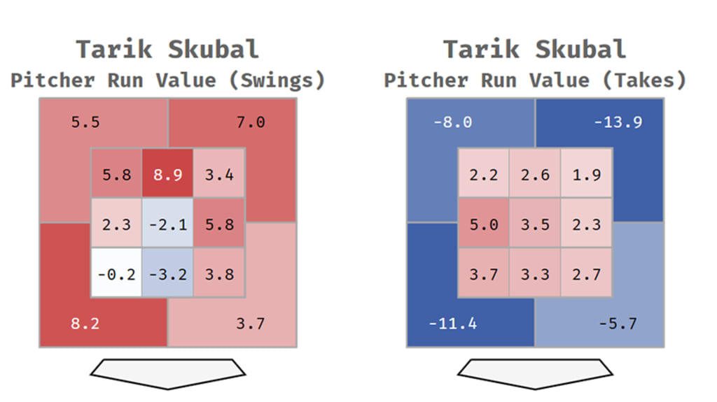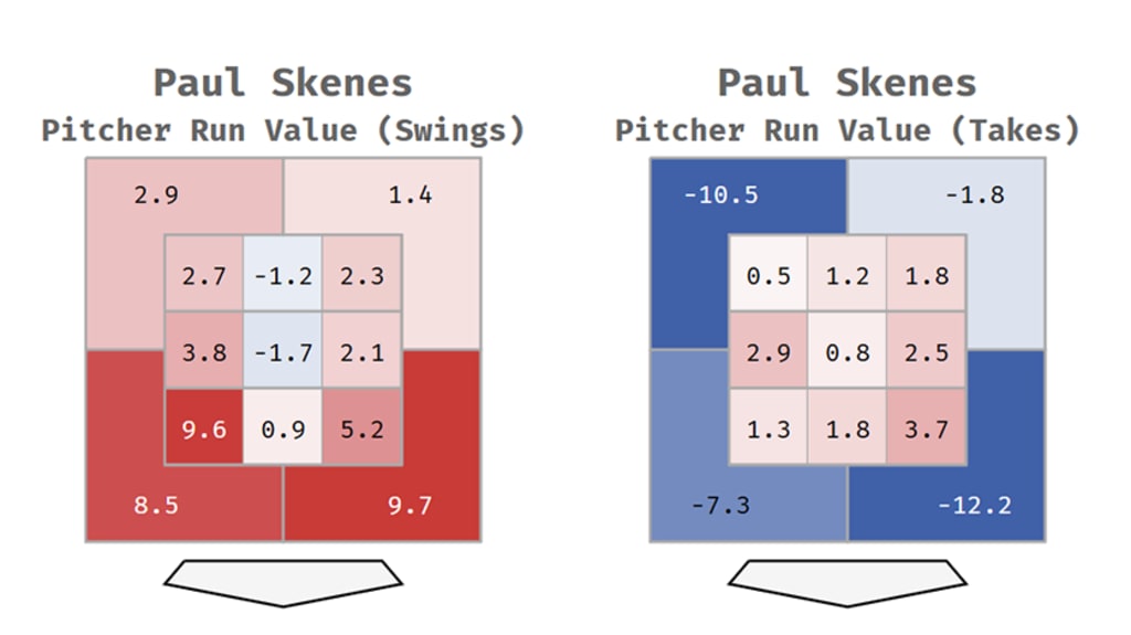 But because Skenes throws from a relatively low release angle, he’s not really your old-school over-the-top bat-misser – he’s more of an east-west with-a-deadly-splinker type. That means that he finds a lot of his value low, particularly in the two lower corners of the zone, and the lower areas outside the zone. No one in baseball, in fact, had a higher run value in those four spots than his +19 runs -- despite the fact that he threw only the 63rd-most pitches there.