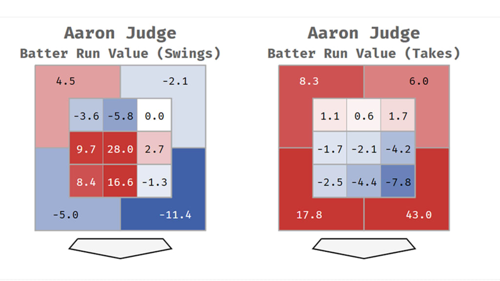 But when he does swing, or make contact, it’s pretty clear where he wants to eat -- low and inside. In those four zones -- middle-middle and -in, and low-middle and -in -- Judge was worth +52 runs, by far the most, with Brent Rooker’s +35 lagging far behind. That’s on all swings, not just all contact, so he’s got that +52 even including the times he swings and misses.