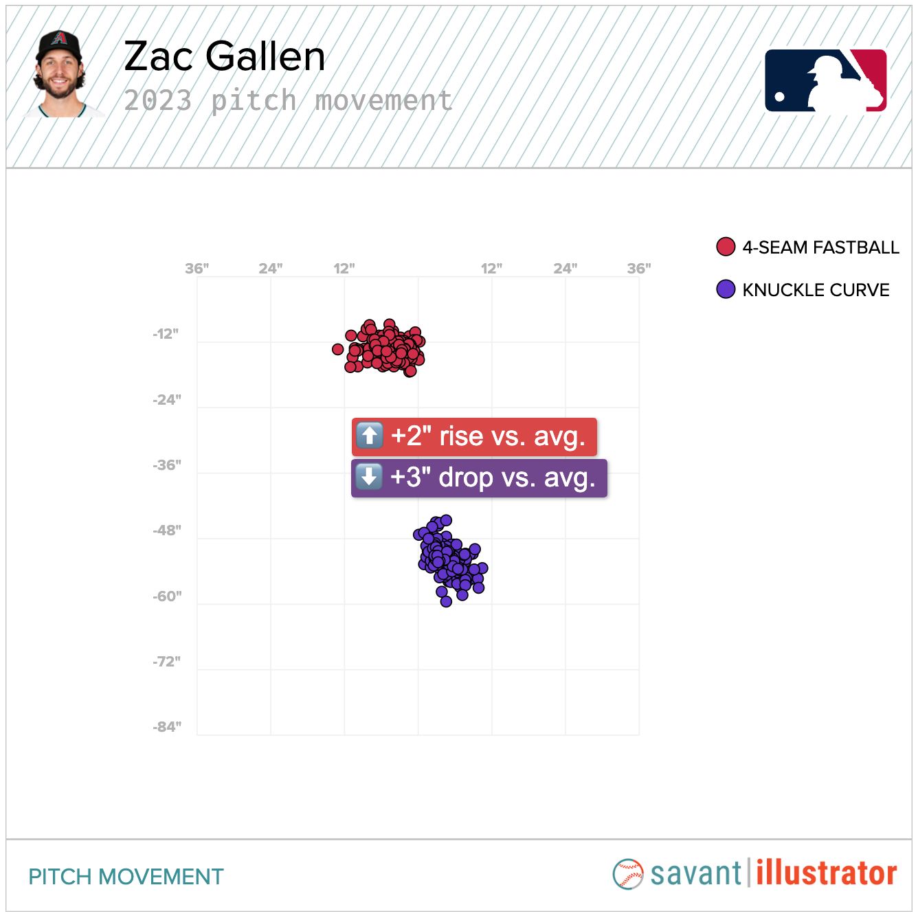 Gallen's four-seam fastball has a lot of carry. Even though he sits only around 94 mph, his fastball gets about two inches more "rise" than an average four-seamer. Meanwhile, his 83 mph knuckle-curve is generating three inches more drop than an average curveball. They're his weapons to pitch vertically.