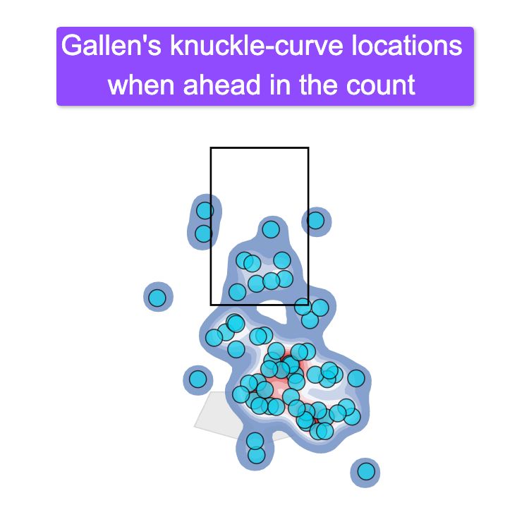Once he gets ahead of a hitter, Gallen buries his curveball below the zone. Look at where he's throwing his knuckle-curve in pitchers' counts.