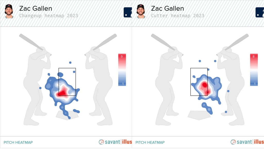 Gallen's cutter and changeup, on the other hand, are for pitching horizontally. They come in at almost the same velocity (88 mph for the cutter, 86 mph for the changeup) and drop basically the same amount. But they break in opposite directions across the zone -- the cutter cuts five inches to his glove side, and the changeup fades 13 inches to his arm side -- and Gallen throws them to opposite sides of the plate.