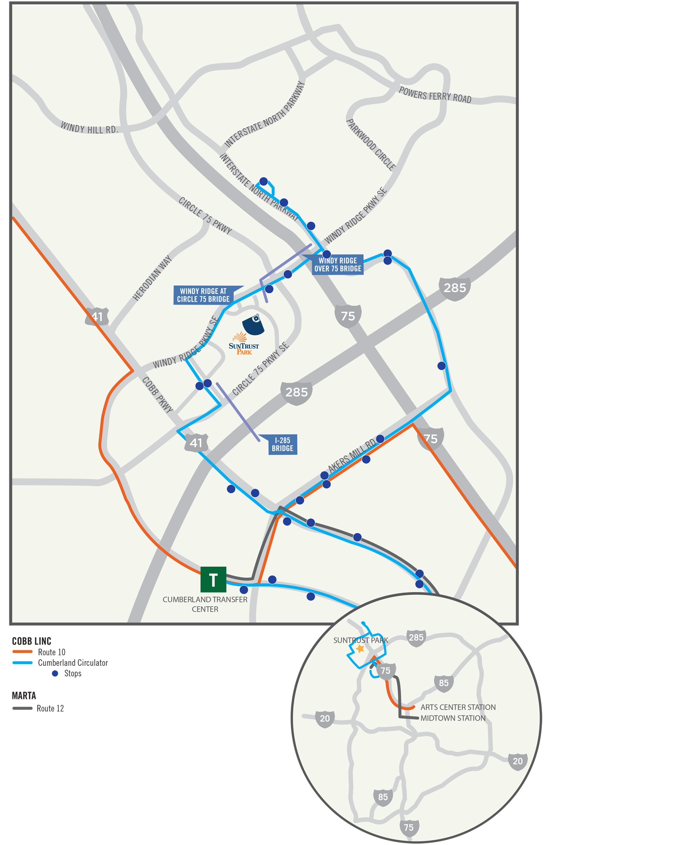 Podrás abordar Marta Bus 12 en la estación MARTA en el medio de la ciudad que viaja a Cumberland Mall. A punto de llegar al Cumberland Mall Transfer Center- por favor toma el Cumberland Circular Shuttle (la ruta azul o verde) para llegar a The Battery Atlanta & Truist Park.