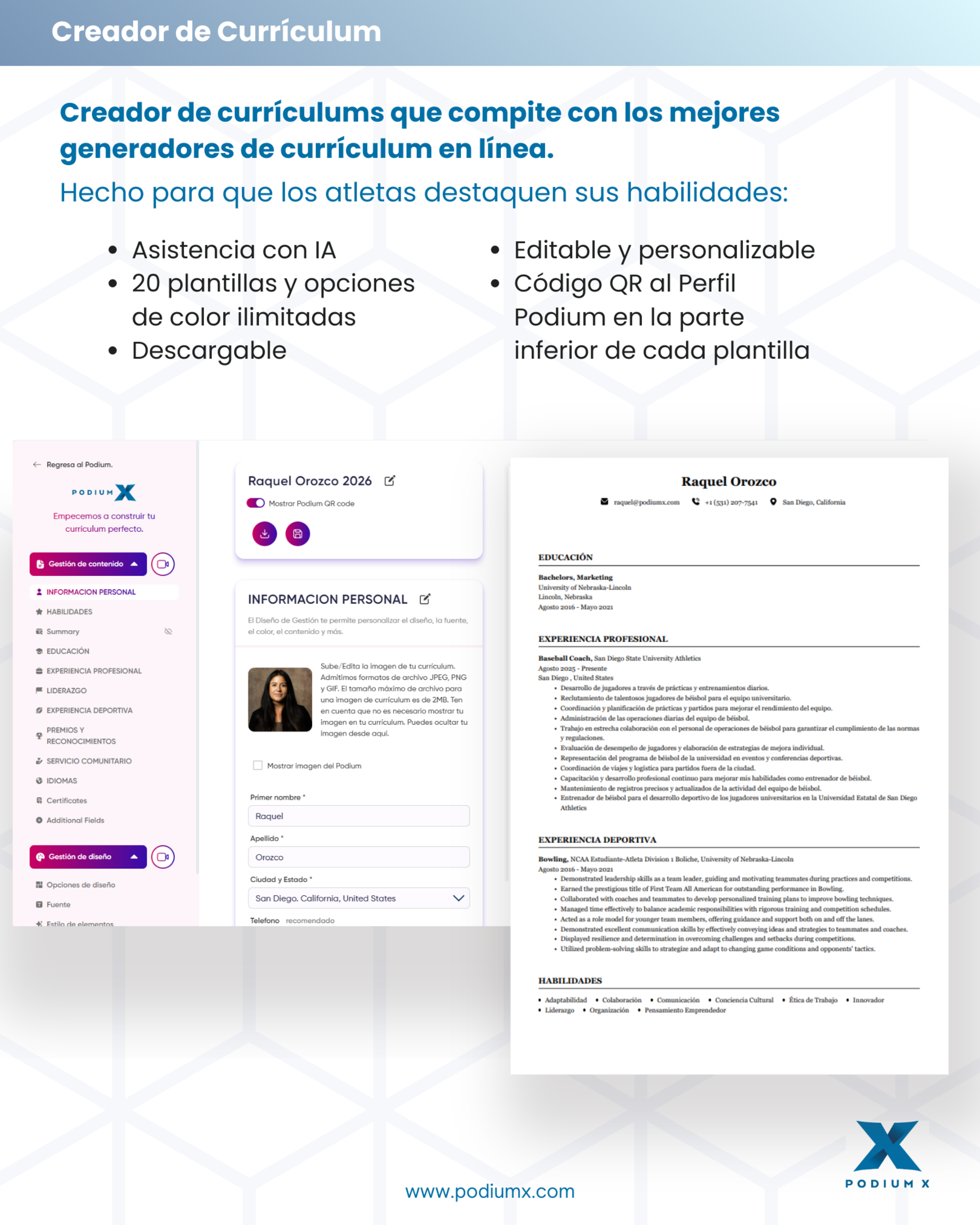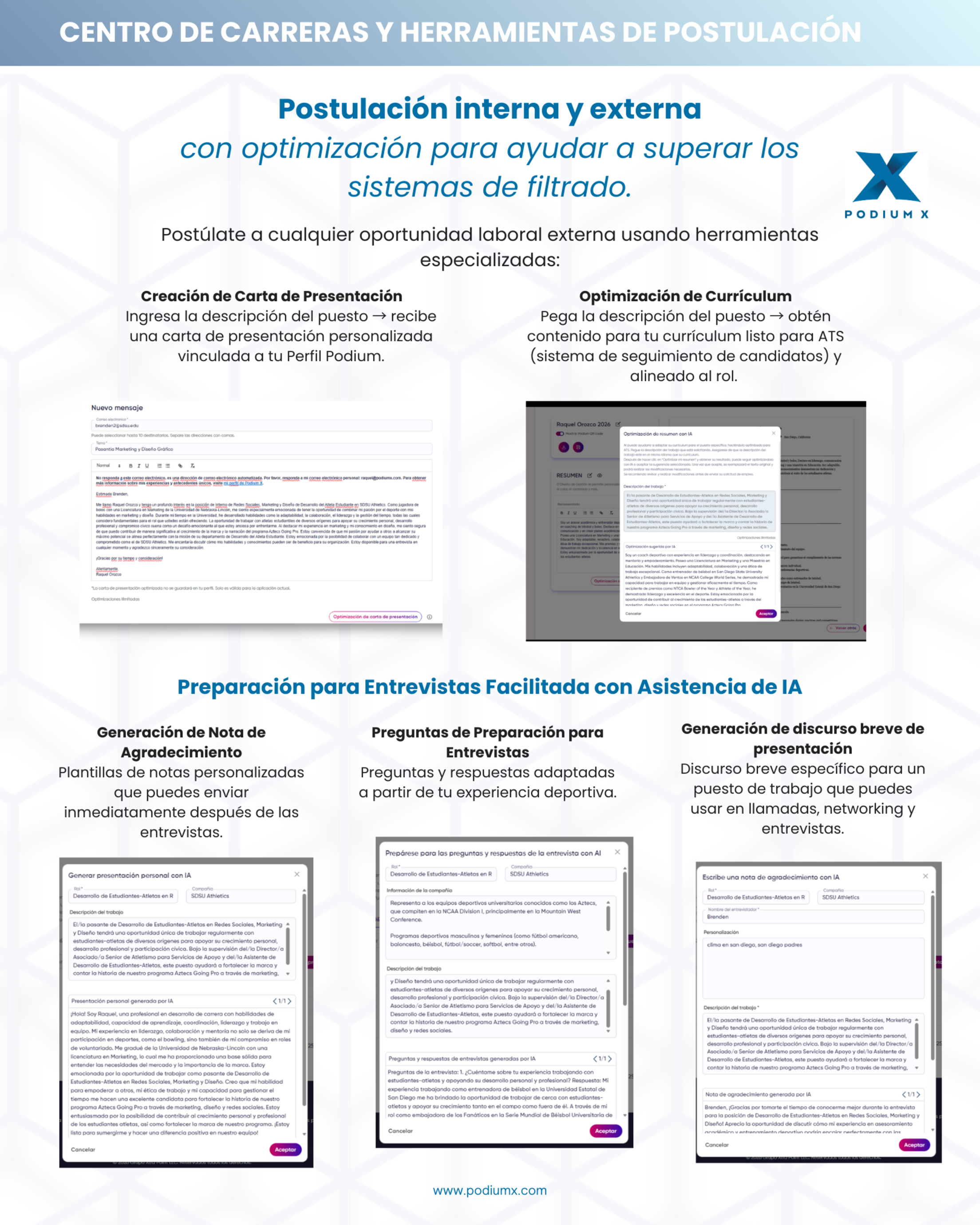 A través de Podium X, apoyamos a los jugadores durante todo el proceso de colocación laboral. Podium X es una plataforma de desarrollo profesional diseñada para atletas, que les permite mostrar las habilidades y cualidades que los hacen exitosos más allá del deporte.
