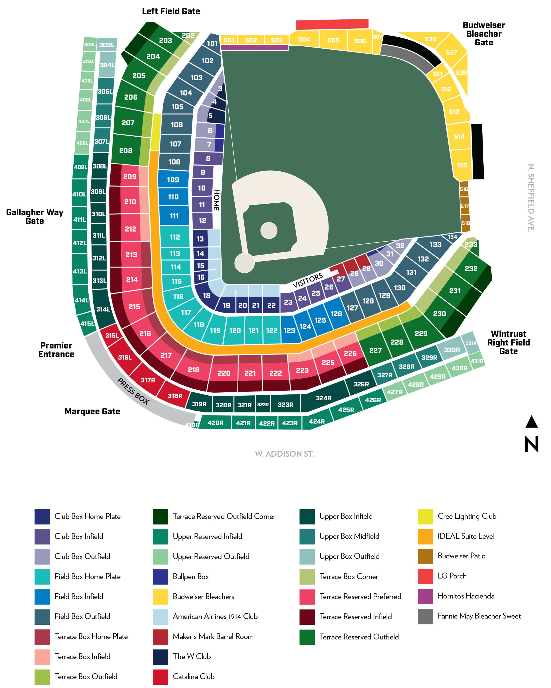 - Wintrust Right Field Gate, anteriormente conocida como Gate D, se encuentra en Addison Street en el lado sureste del estadio de béisbol.