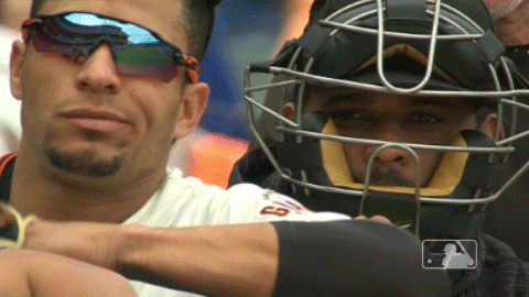 Gorkys Hernández y Pablo Sandoval tuvieron que protegerse de los batazos de foul de Alen Hanson
