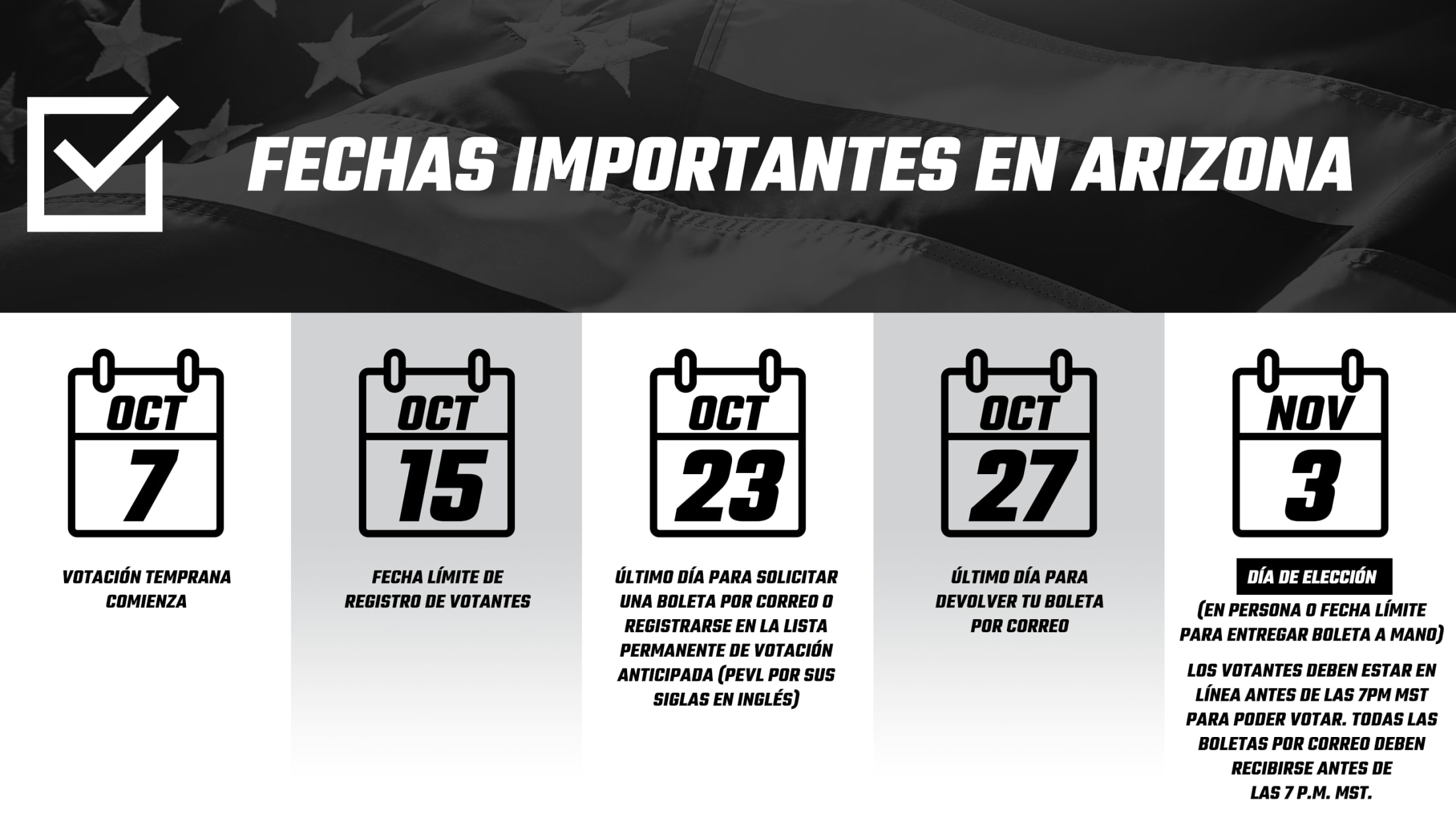 Todo elector calificado debe mostrar una prueba de identidad en el lugar de votación antes de recibir una boleta. Vea la forma aceptada de identificación en Arizona aquí.