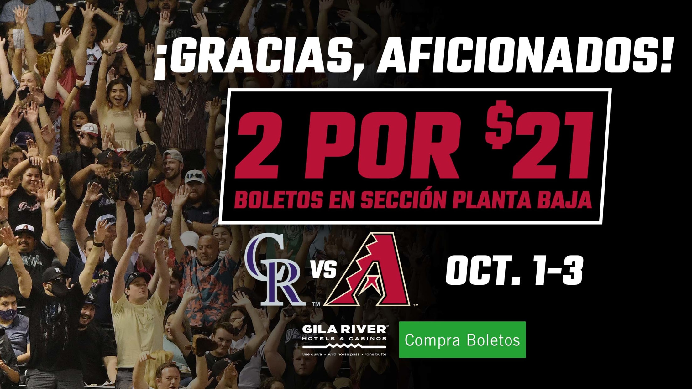 Obtén 2 boletos en planta baja por solo $21. Oferta válida en las secciones Bleachers, Bullpen y Baseline Reserve. Quédate después del juego el viernes 1 de octubre para disfrutar del último espectáculo de fuegos artificiales de la temporada, presentado por Gila River Hotels & Casinos.