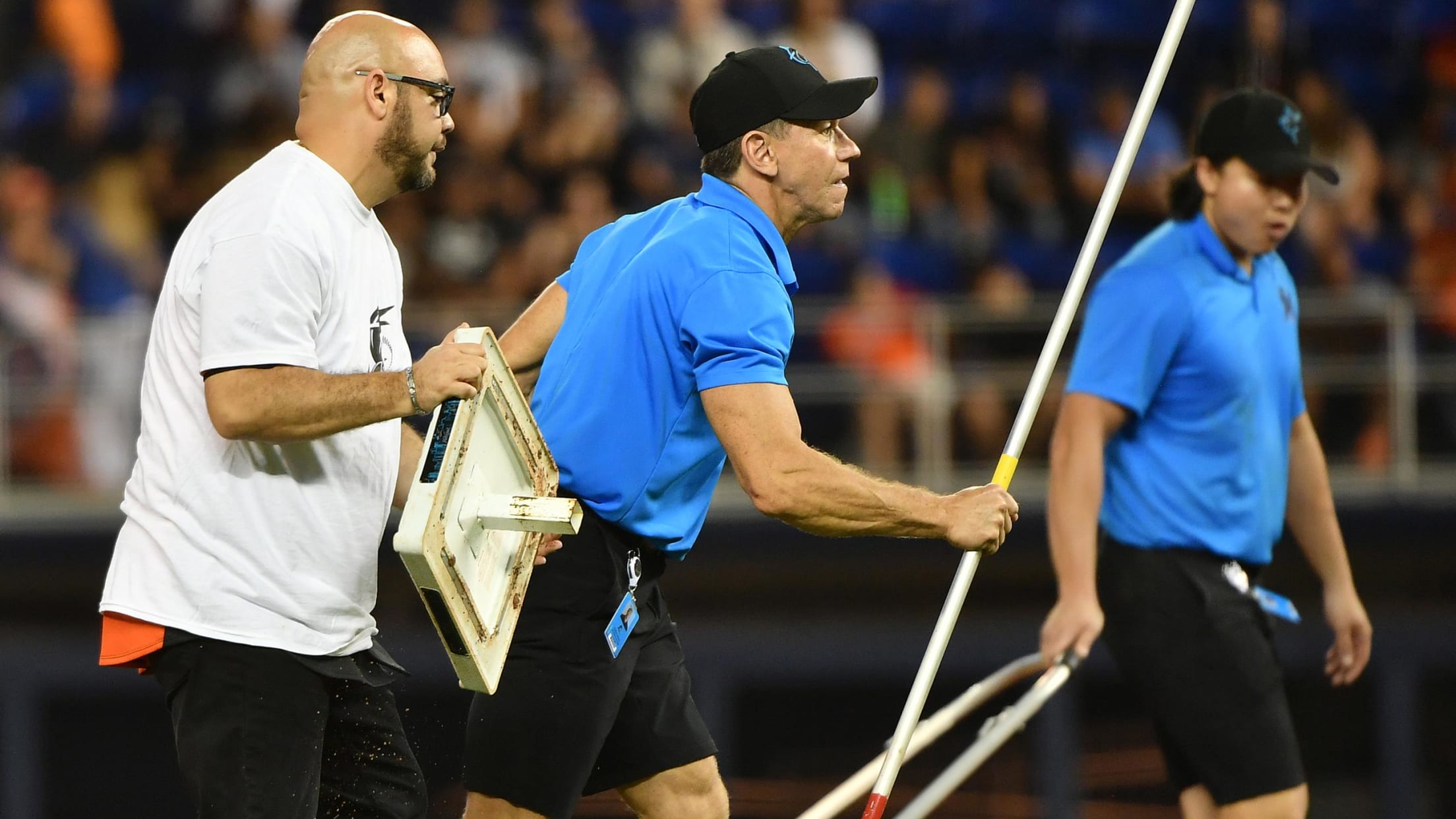 Únete al equipo del terreno de los Marlins para cambiar las bases en una de las pausas entre innings.